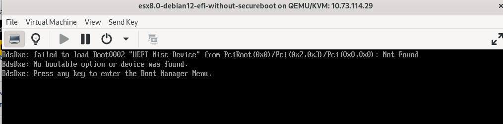 Unable to boot Debian 12 VM with UEFI (secureboot=false) after cold migrating to Openshift Virtualization using MTV.