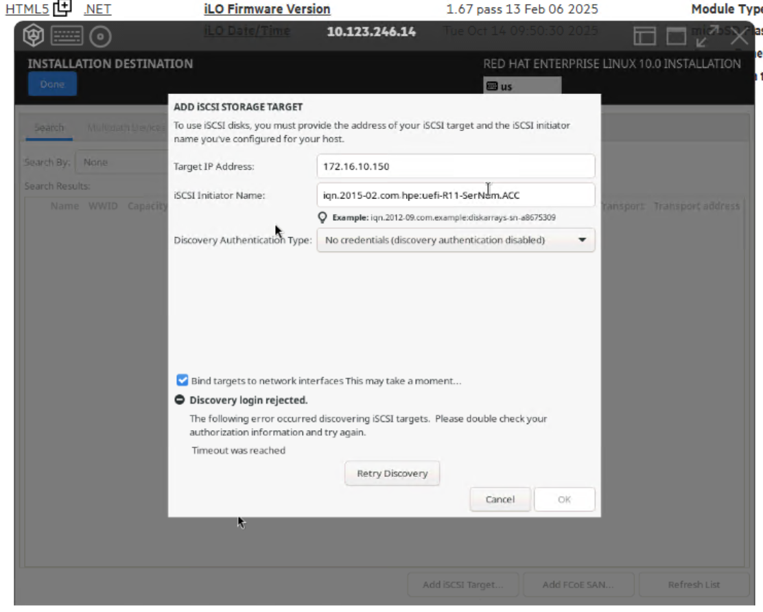 Discovery login rejected while installing RHEL over iSCSI