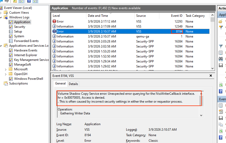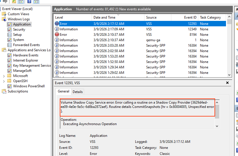 Customer suspect some of the BSOD could be lead by frequent VSS error: Error   2/1/2026 4:19:00 PM Volsnap 8   None; which means host side snapshot was not completed within 10s, which is the default timeout of Windows fsfreeze; Windows will automatically thaw itself by force after fsfreeze executed and customer believe there was data corruption in this process which accumulated and eventually lead to BSOD.