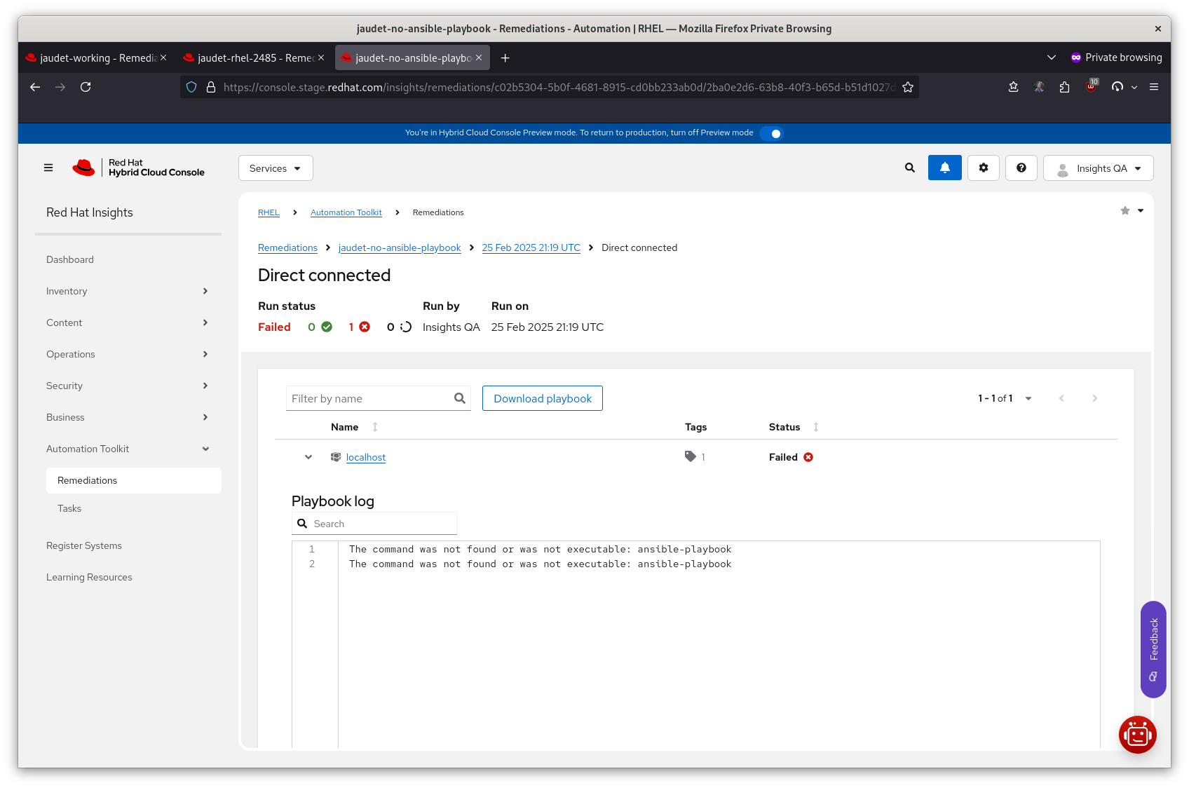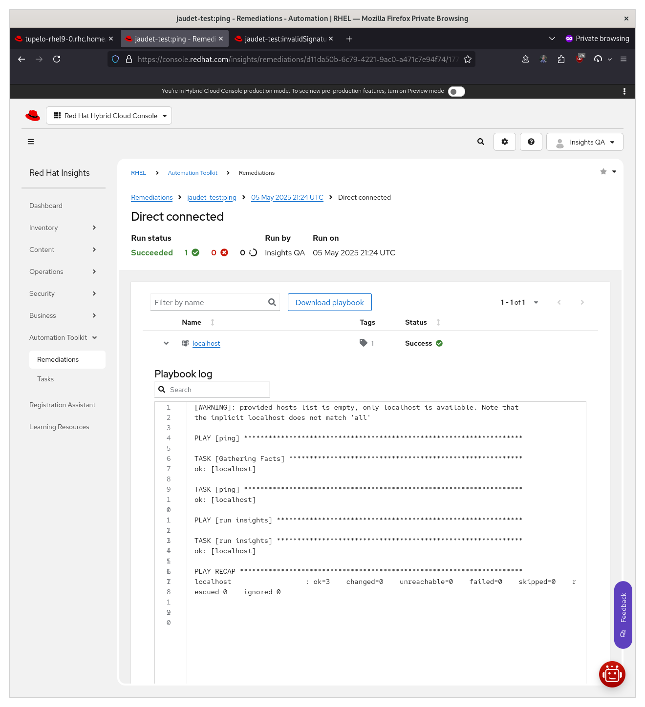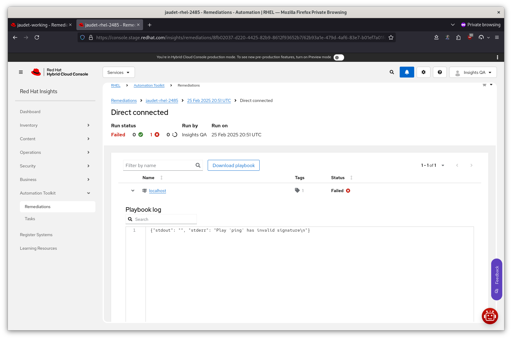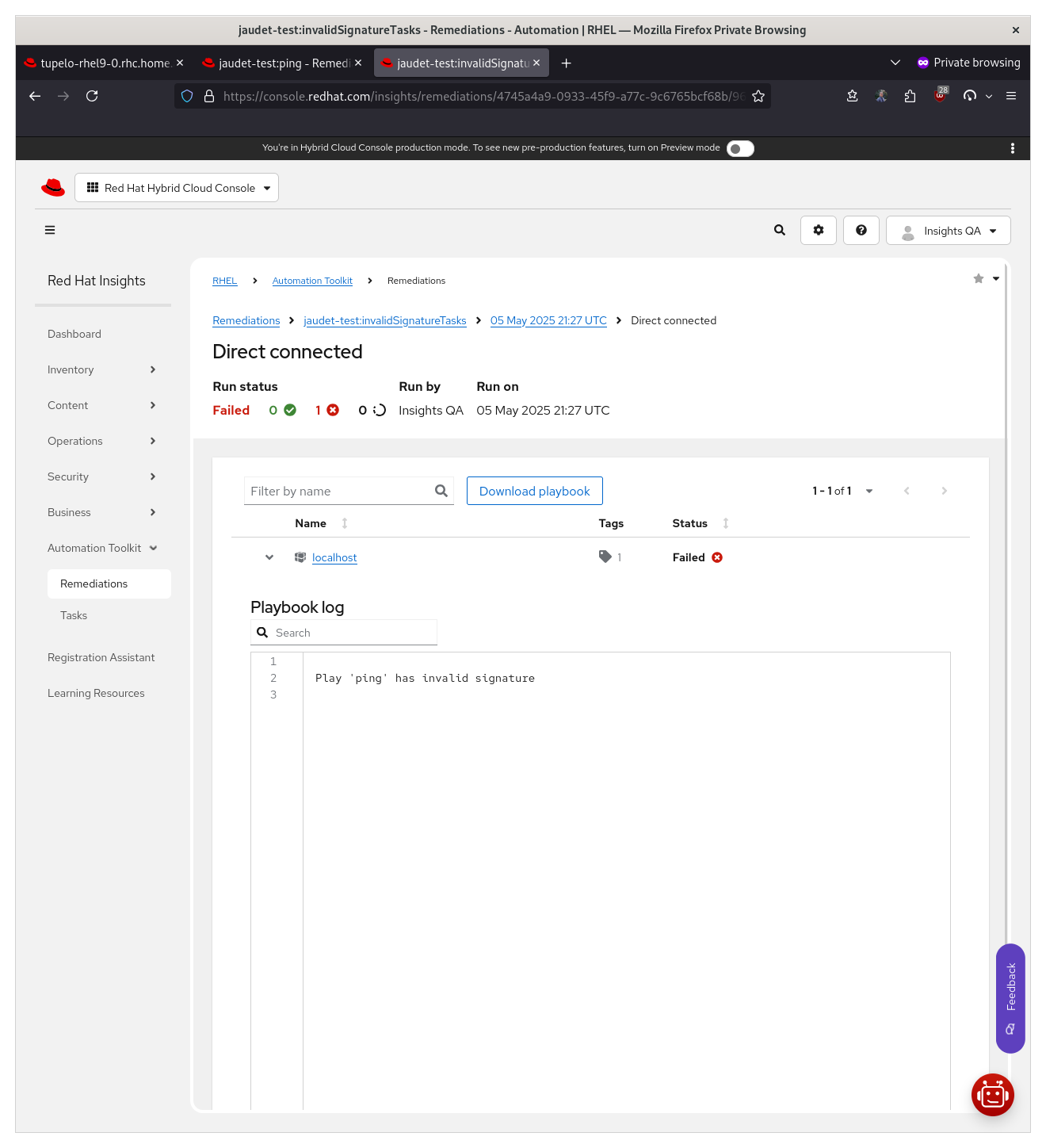 It may happen that rhc-worker-playbook receives a playbook that fails the signature check. In that case, the worker raises an exception, execution never starts, and nothing is reported to console.redhat.com.