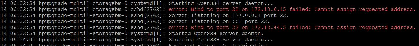 Nov 13 13:41:21 hpupgrade-multi1-storagebm-0 sshd[2791]: error: Bind to port 22 on 172.18.6.15 failed:
