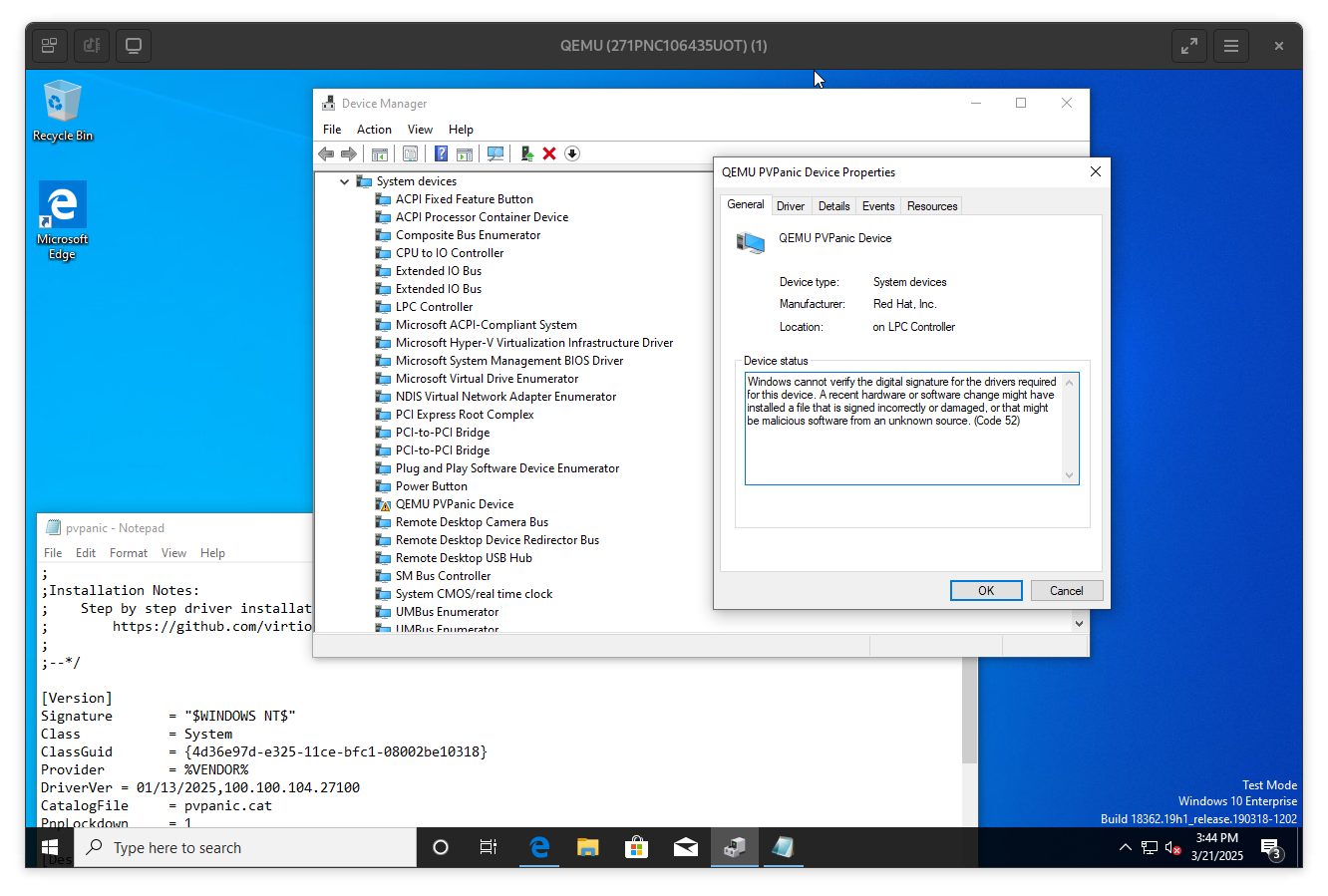 virtio-win-pvpanic: The prewhql 271 build fails on Windows 10 1903 with VBS enabled. It only happens on the Win10.x86_64, no hit it on the Win10.i386. The workaround is to close the VBS function.