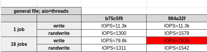Performance Degradation(aio=threads) between Upstream Commit b75c5f9 and 984a32f
