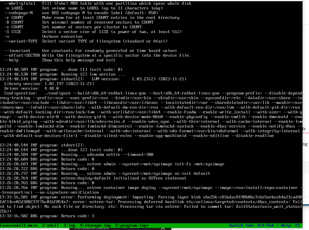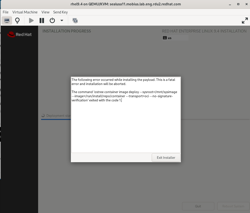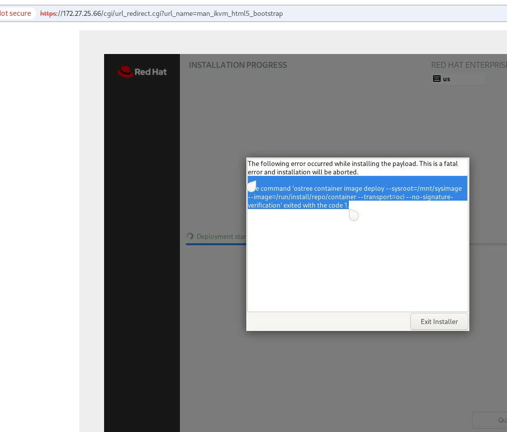 The command 'ostree container image deploy --sysroot=/mnt/sysimage --image=/run/install/repo/container --transport=oci --no-signature-verification' exited with the code 1.