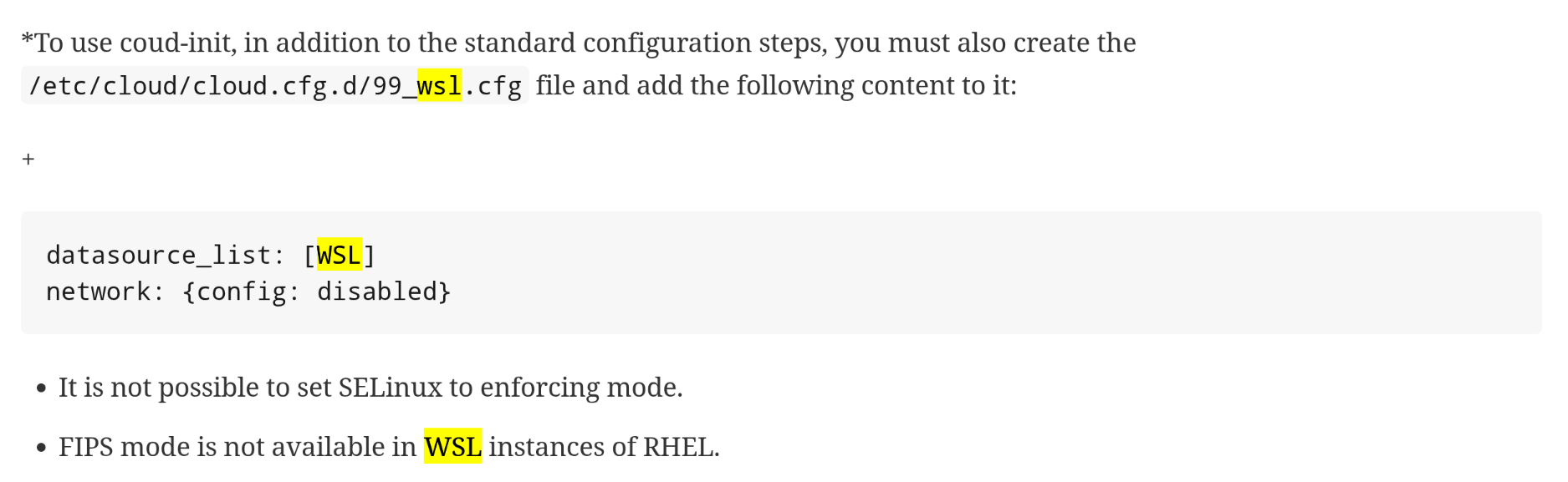 .WSL images of RHEL 8 - 10 are available on the Customer Portal RHEL 8, RHEL 9, and RHEL 10 images for the Windows Subsystem for Linux (WSL) can now be downloaded from the Red Hat Customer Portal. These images are available for all RHEL subscriptions, including no-cost developer subscriptions. By using the WSL images, you can create RHEL instances on your Windows system. Note that the WSL images are provided as self-supported. As such, they are not supported by Red Hat, and are intended for application development purposes only. In addition, the following issues are currently present in the RHEL WSL instances for Podman and cloud-init if you use a WSL image with a Windows WSL host: * WSL instances of RHEL might work incorrectly in a graphical interface. Using a text user interface is recommended instead. * To use podman, you must add the following lines to the `/etc/containers/containers.conf` file, in addition to the standard configuration steps: + ---- [network] firewall_driver="iptables" ---- * To use cloud-init, you must create the `/etc/cloud/cloud.cfg.d/99_wsl.cfg` file and add the following content to it, in addition to the standard configuration steps: + ---- datasource_list: [WSL] network: {config: disabled} ---- * It is not possible to set SELinux to enforcing mode. * FIPS mode is not available in WSL instances of RHEL.