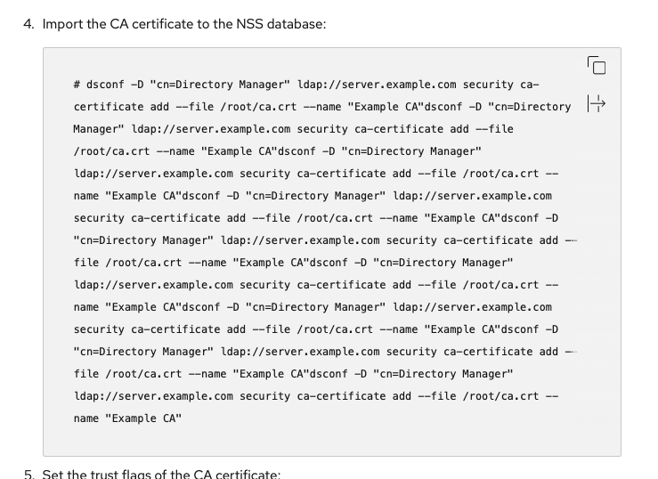 dsconf -D "cn=Directory Manager" ldap://server.example.com security ca-certificate add --file /root/ca.crt --name "Example CA"dsconf -D "cn=Directory Manager" ldap://server.example.com security ca-certificate add --file /root/ca.crt --name "Example CA"dsconf -D "cn=Directory Manager" ldap://server.example.com security ca-certificate add --file /root/ca.crt --name "Example CA"dsconf -D "cn=Directory Manager" ldap://server.example.com security ca-certificate add --file /root/ca.crt --name "Example CA"dsconf -D "cn=Directory Manager" ldap://server.example.com security ca-certificate add --file /root/ca.crt --name "Example CA"dsconf -D "cn=Directory Manager" ldap://server.example.com security ca-certificate add --file /root/ca.crt --name "Example CA"dsconf -D "cn=Directory Manager" ldap://server.example.com security ca-certificate add --file /root/ca.crt --name "Example CA"dsconf -D "cn=Directory Manager" ldap://server.example.com security ca-certificate add --file /root/ca.crt --name "Example CA"dsconf -D "cn=Directory Manager" ldap://server.example.com security ca-certificate add --file /root/ca.crt --name "Example CA"