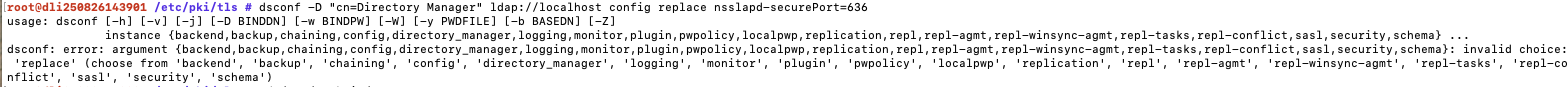 dsconf: error: argument {backend,backup,chaining,config,directory_manager,logging,monitor,plugin,pwpolicy,localpwp,replication,repl,repl-agmt,repl-winsync-agmt,repl-tasks,repl-conflict,sasl,security,schema}: invalid choice: '\xa0security' (choose from 'backend', 'backup', 'chaining', 'config', 'directory_manager', 'logging', 'monitor', 'plugin', 'pwpolicy', 'localpwp', 'replication', 'repl', 'repl-agmt', 'repl-winsync-agmt', 'repl-tasks', 'repl-conflict', 'sasl', 'security', 'schema')
