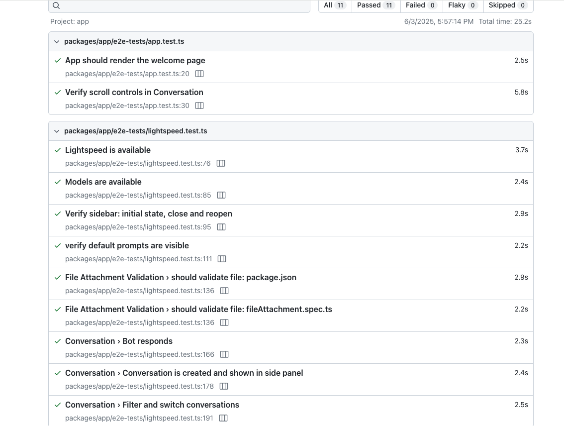 • Chatbot response is validated to contain OpenShift deployment details after sending a sample message.