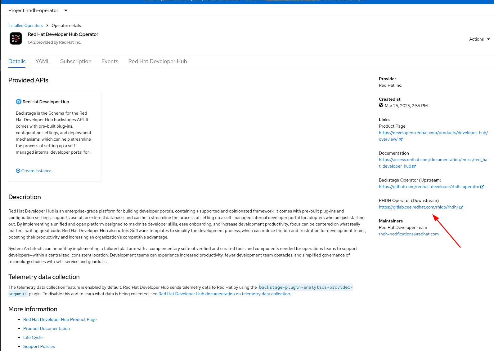 On the Operator Details page there is a link on the right side under the links for RHDH Operator (Downstream): https://gitlab.cee.redhat.com/rhidp/rhdh/