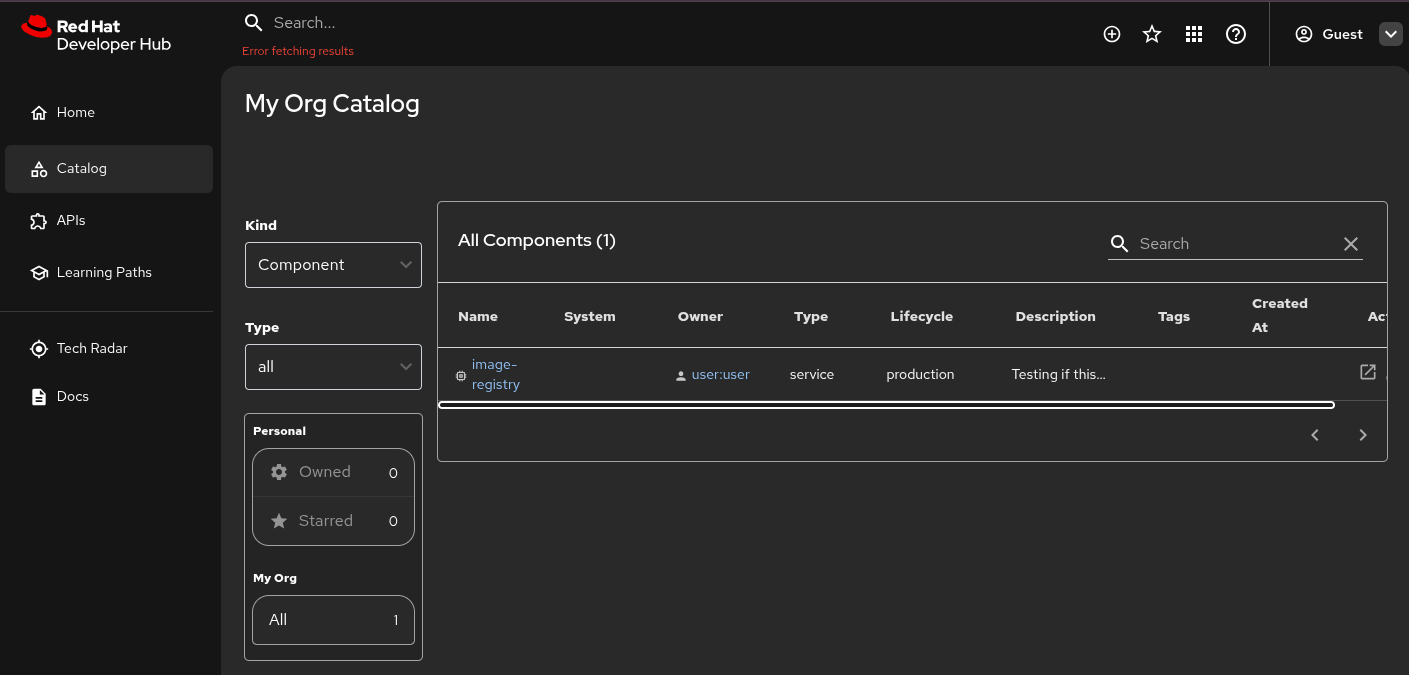 Upon startup, the "Image Registry" tab must appear for the default "RHDH Local" entity in the catalog.