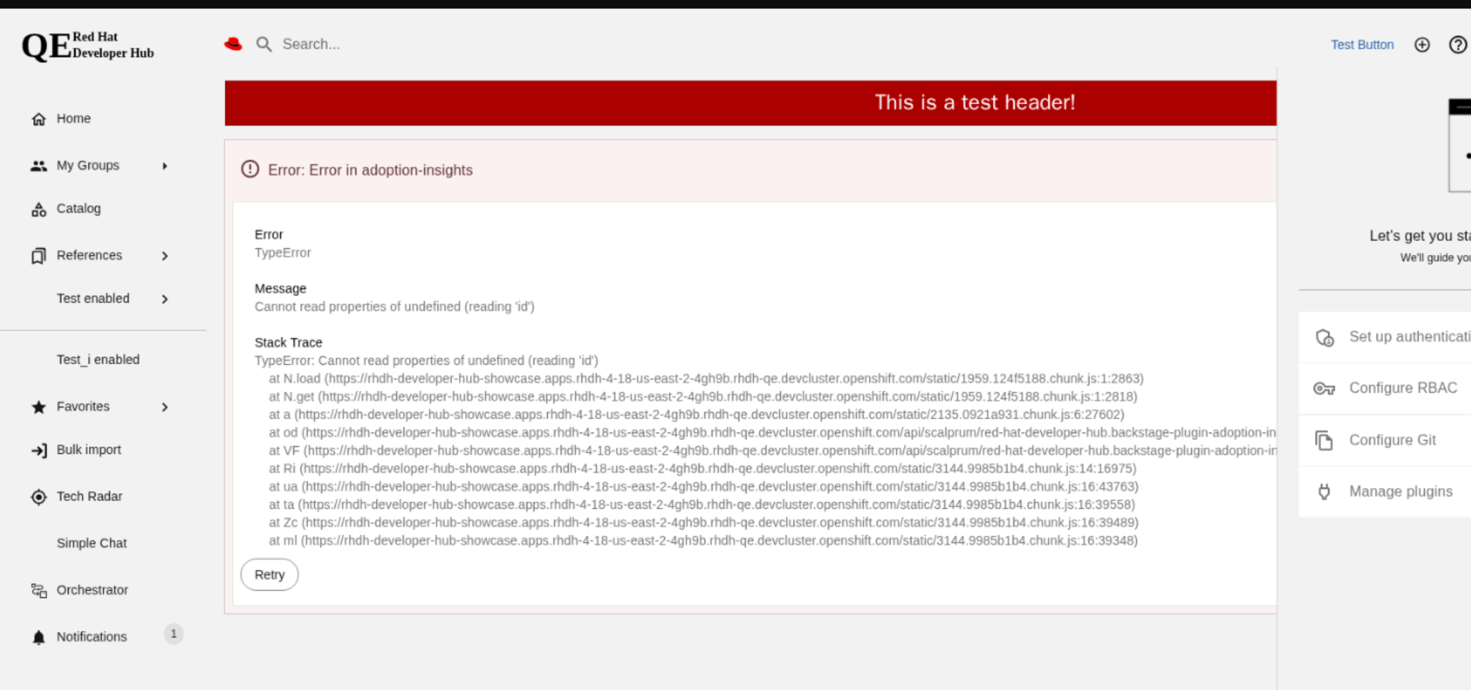 3rd Party Plugin, 3scale, ACR, Actions, ArgoCD, Bulk Import, Community Plugin, jfrog Artifactory, Keycloak Provider, Marketplace, Matomo Analytics Provider Plugin, Nexus Repository Manager, Open Cluster Management, Permissions, Quay, Quay Plugin, Regex, Segment, ServiceNow, Tekton, Theme, Topology, UI