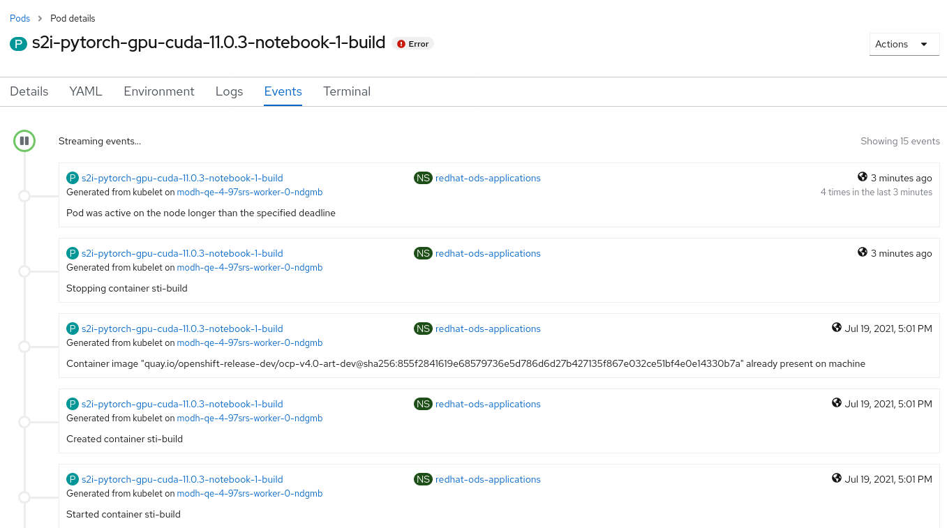 When installing RHODS 1.0.17, either one (or both) between the PyTorch or Tensorflow build pods will time out and fail.