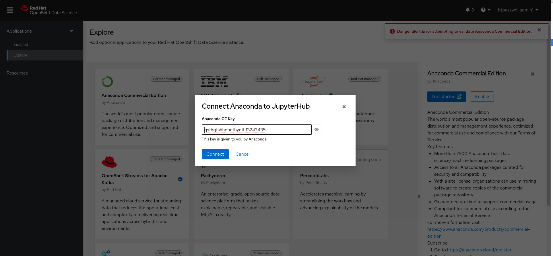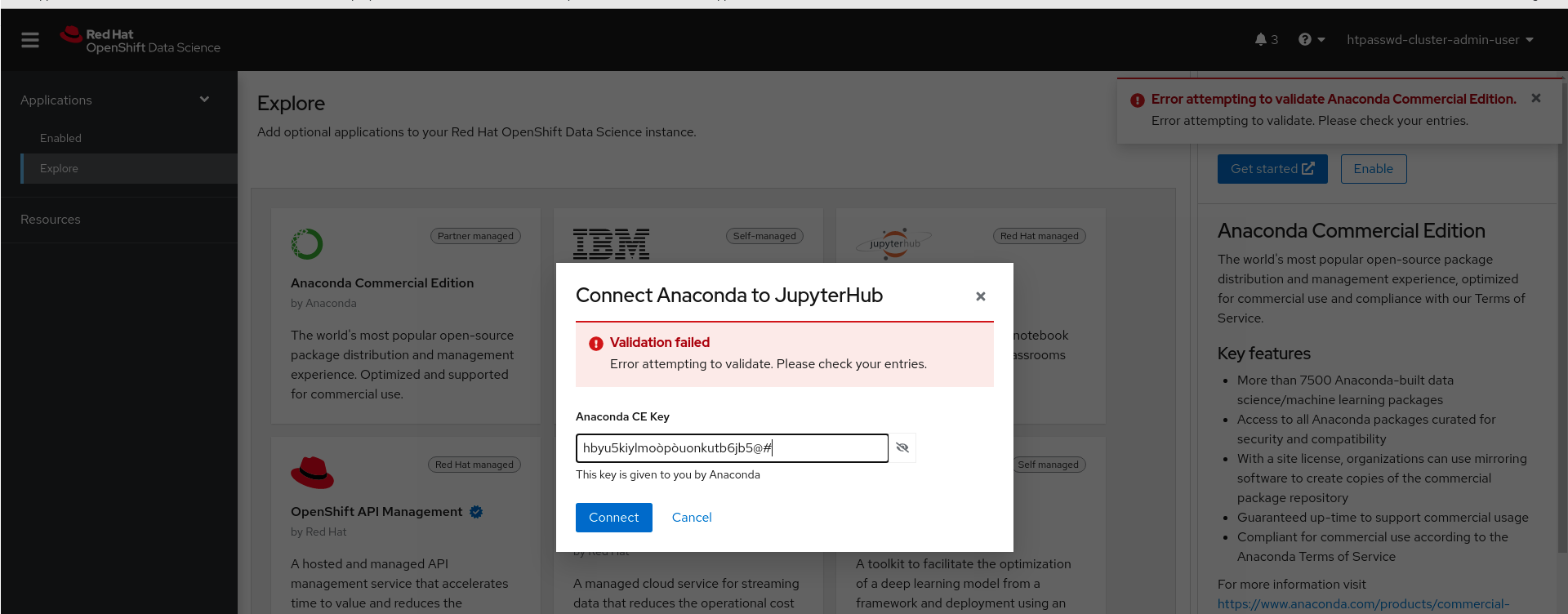 When the attempt to enable an application via a key (Anaconda CE) fails, the UI does not report the error message in the modal.