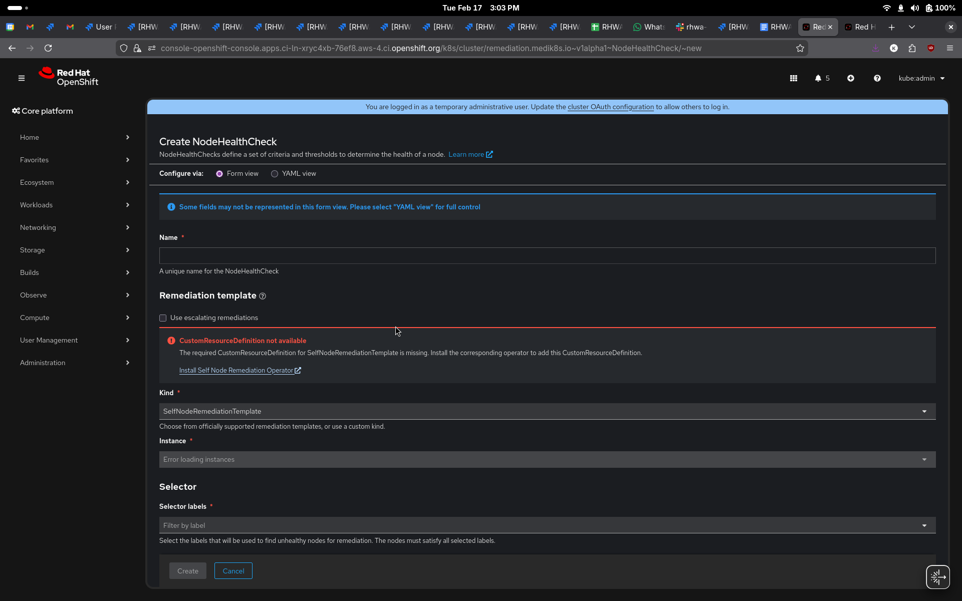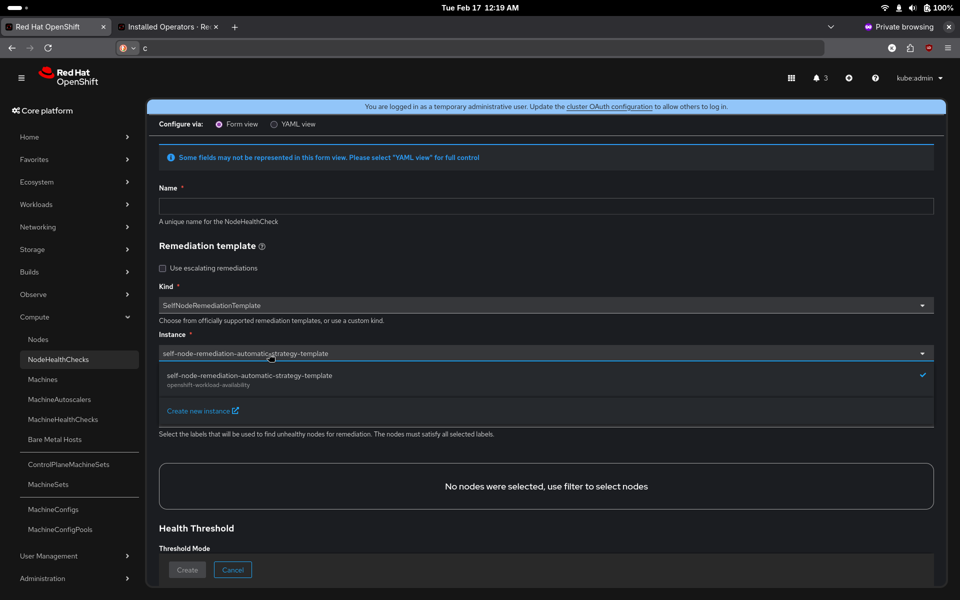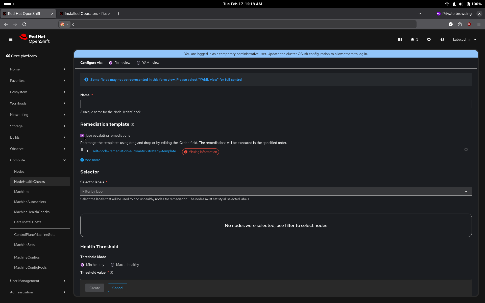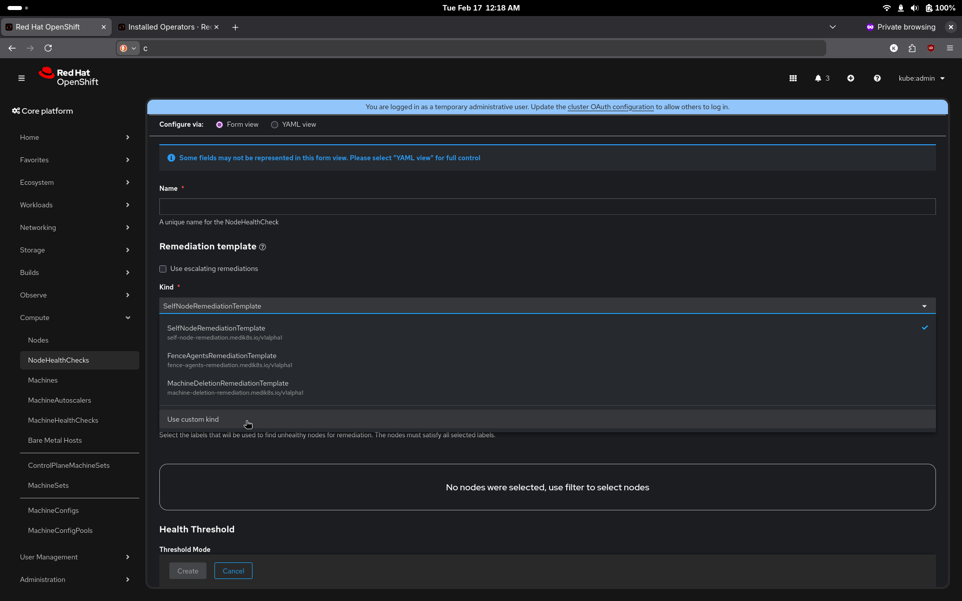 Since SNR isn't installed by default and there are other remediators that can be more suitable for the specific use case, the UI should enable chossing from the available remediation template kinds: SNR, FAR, MDR and later SBD. If the remediator operator isn't installed, the UI should provide a link to install it.