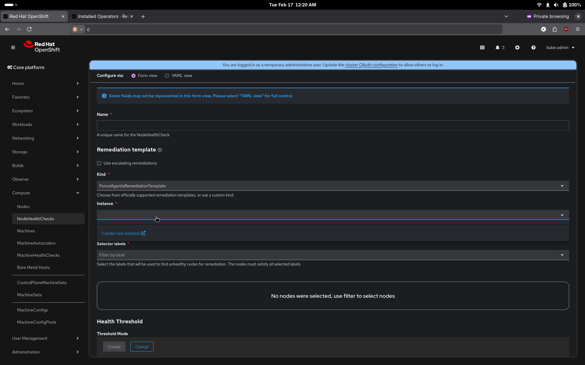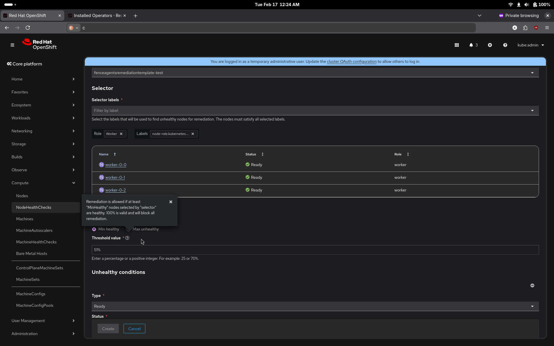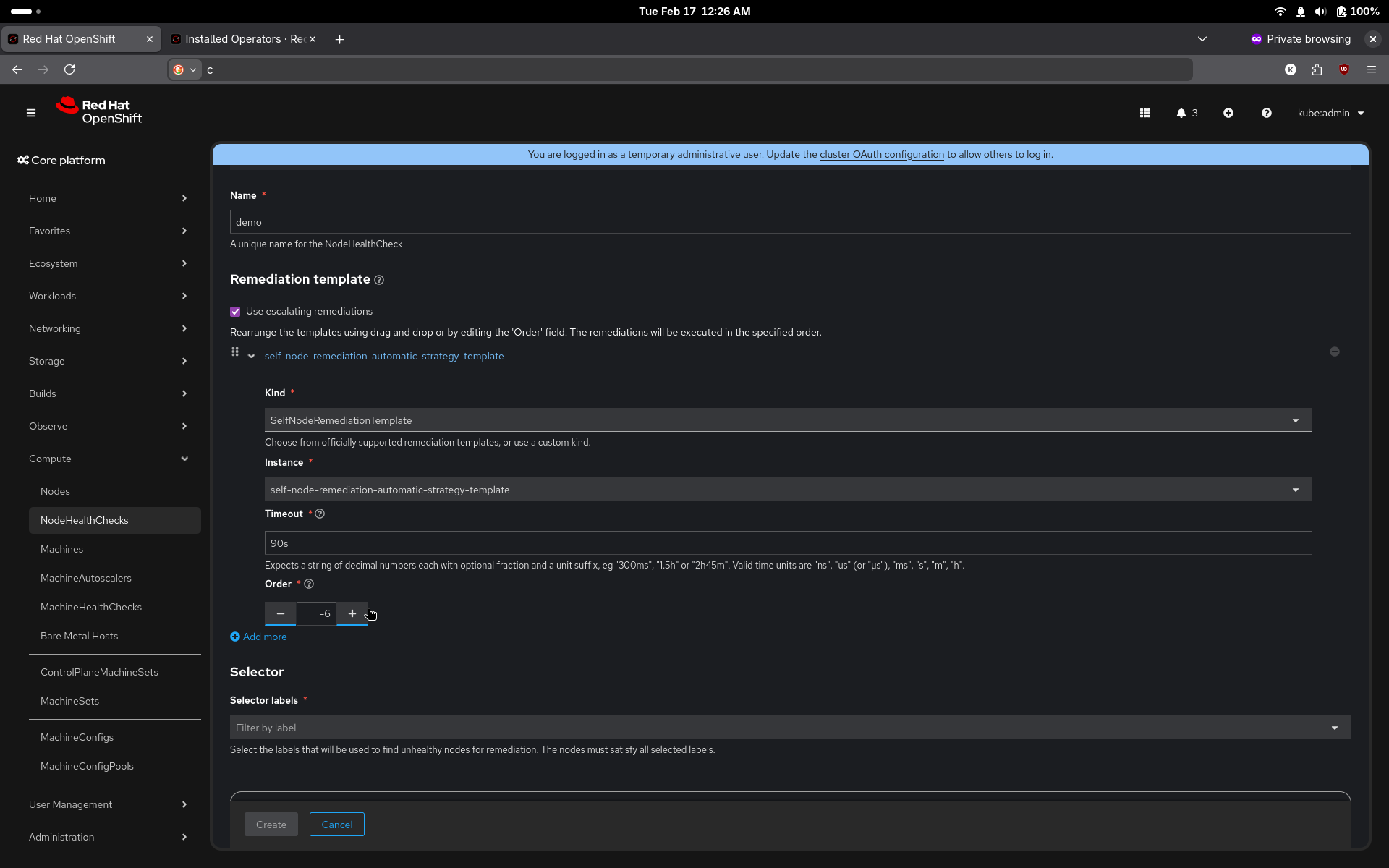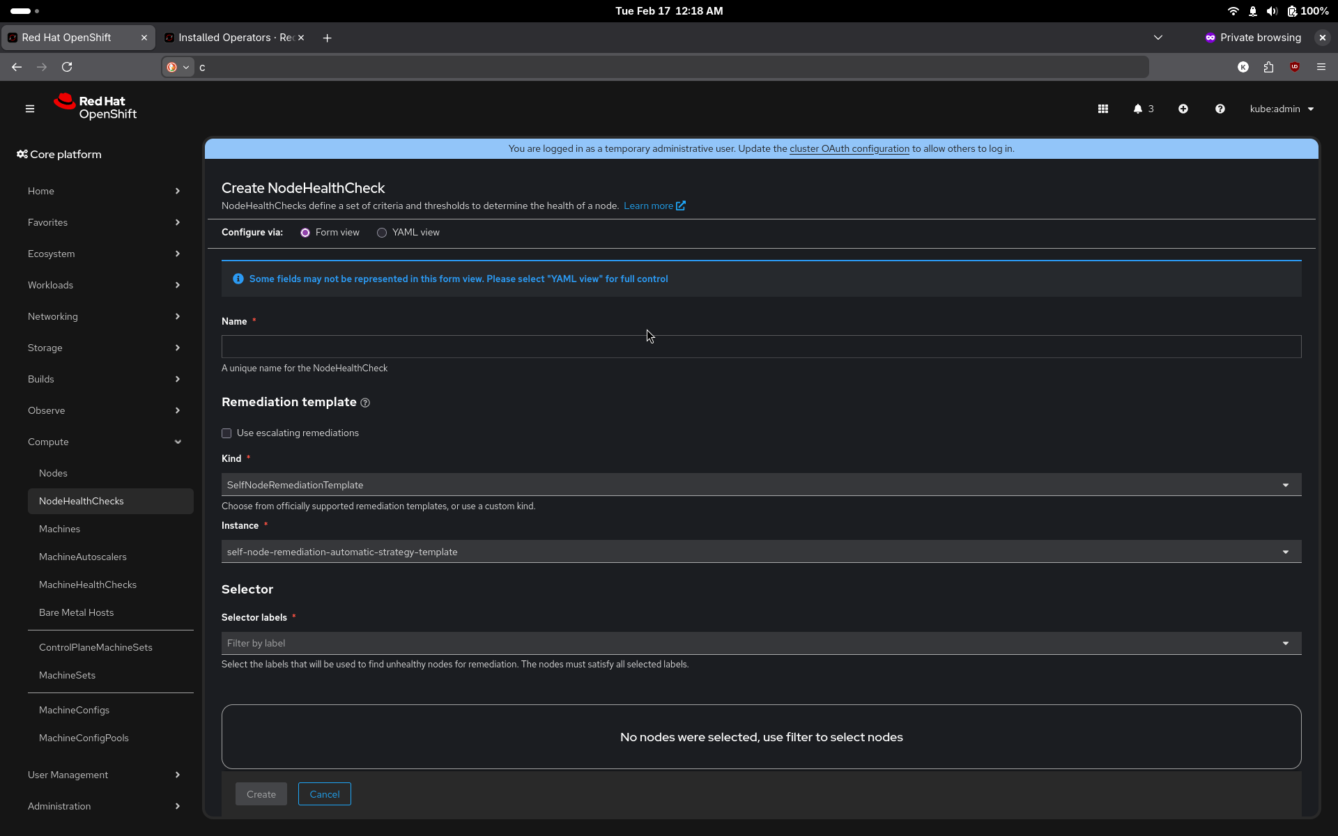 Since SNR isn't installed by default and there are other remediators that can be more suitable for the specific use case, the UI should enable chossing from the available remediation template kinds: SNR, FAR, MDR and later SBD. If the remediator operator isn't installed, the UI should provide a link to install it.