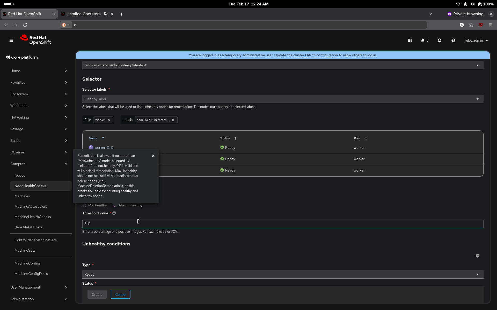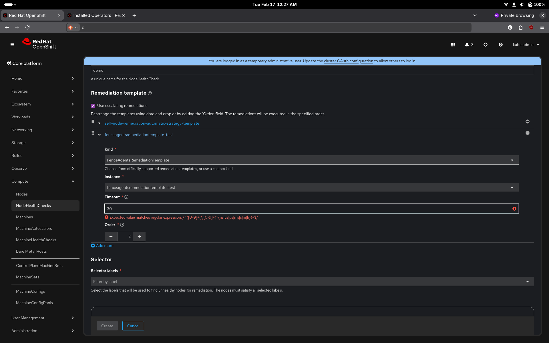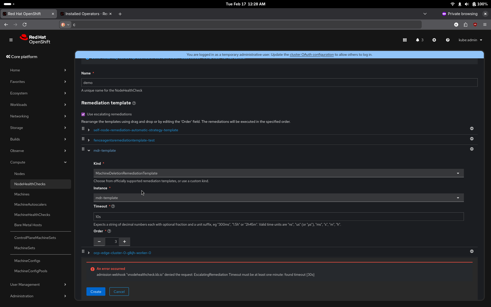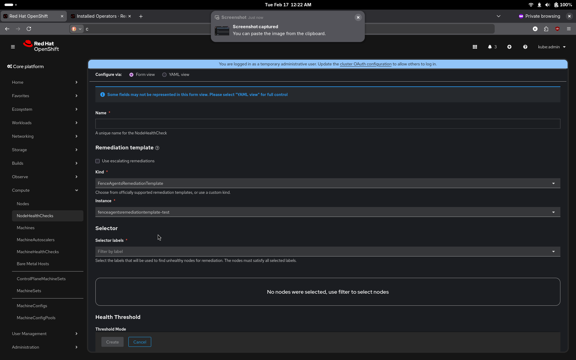 Since SNR isn't installed by default and there are other remediators that can be more suitable for the specific use case, the UI should enable chossing from the available remediation template kinds: SNR, FAR, MDR and later SBD. If the remediator operator isn't installed, the UI should provide a link to install it.