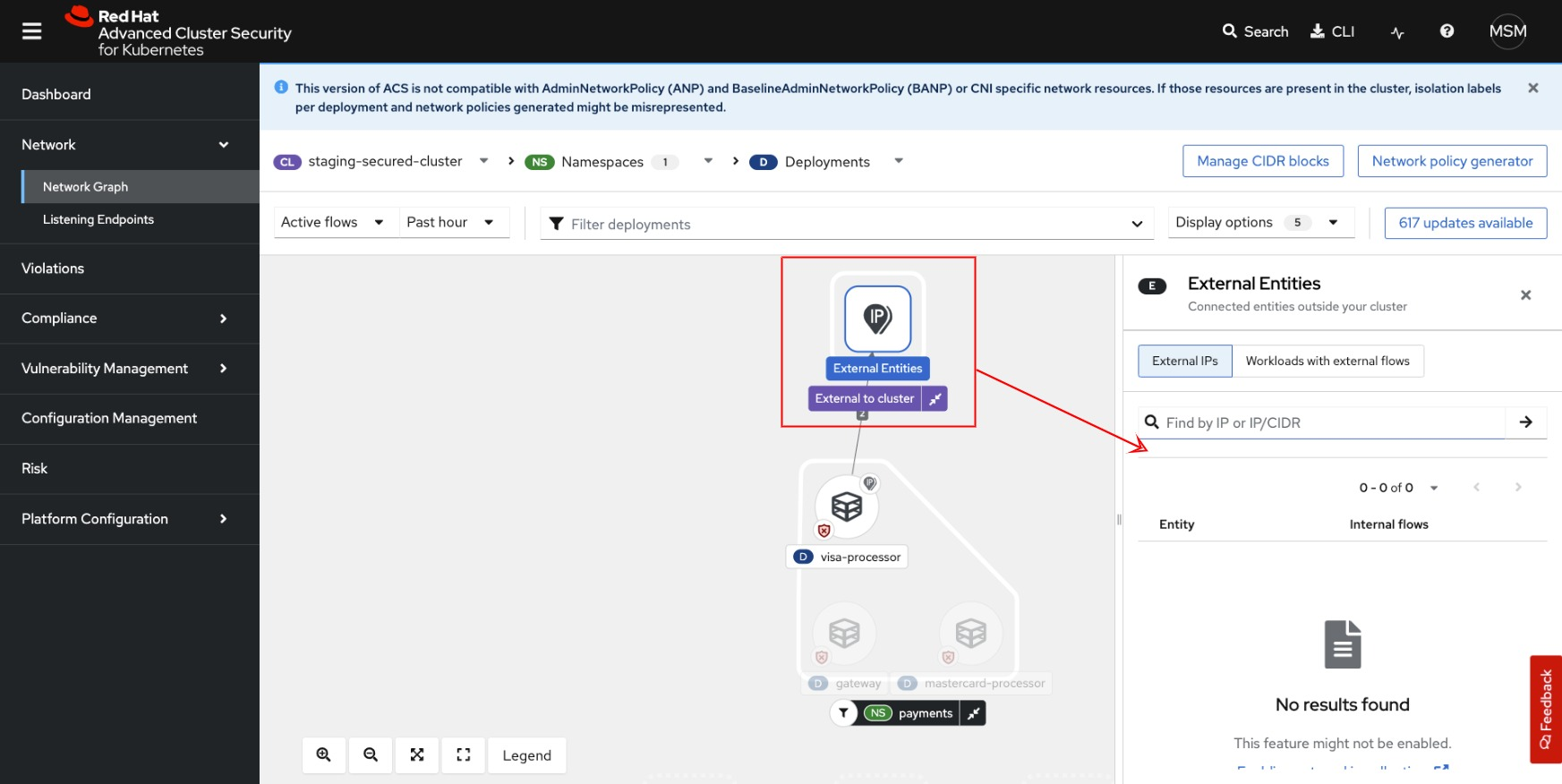 We announce GA of External IP visibility feature. This enhancement provides crucial insight into your cluster's external communications. Now, you can visualize the exact external IP addresses your deployments are communicating with. This significantly improves your ability to understand external connections, identify potential threats, and validate network policies. By default, this feature is disabled. However, once enabled, you will see external IPs in the Network Graph as well as Unauthorized Network Flow violations will automatically include detailed external IP information, streamlining your investigation process.