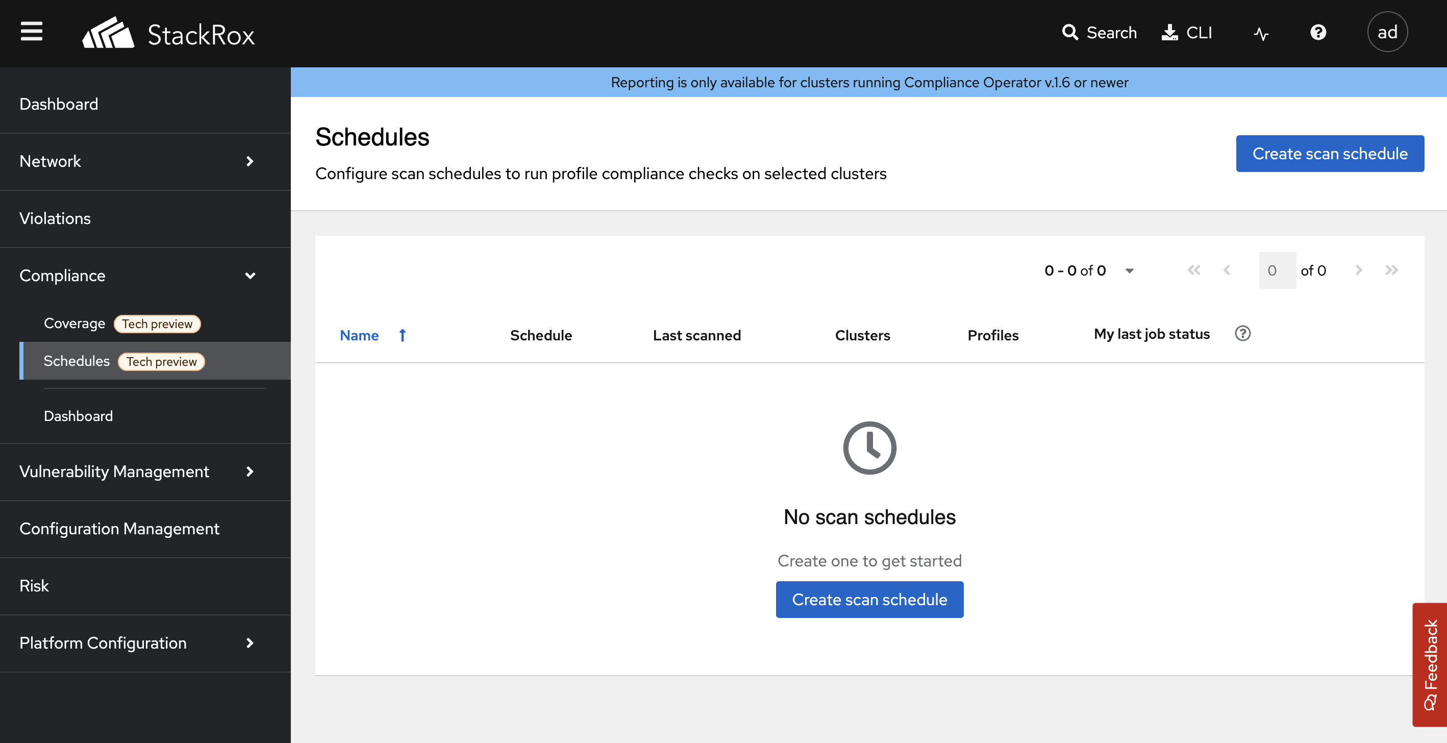 The suggestion is to change Reporting to This feature. Technically it's not limited to just Reporting but to the feature in general. I believe the idea came out of the discussion about the wizard flow. If you're not running a Compliance Operator of v1.6 or newer, the cluster will show up as unhealthy. That means you need this condition met in order to create scan schedules.