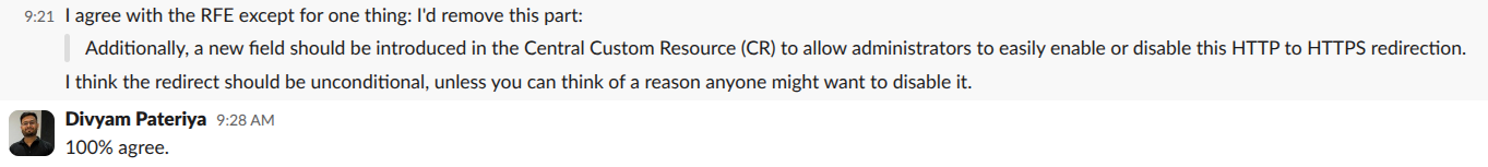 - Retrofitting automatic HTTPS redirection to other RHACS routes (e.g., Scanner, Collector)