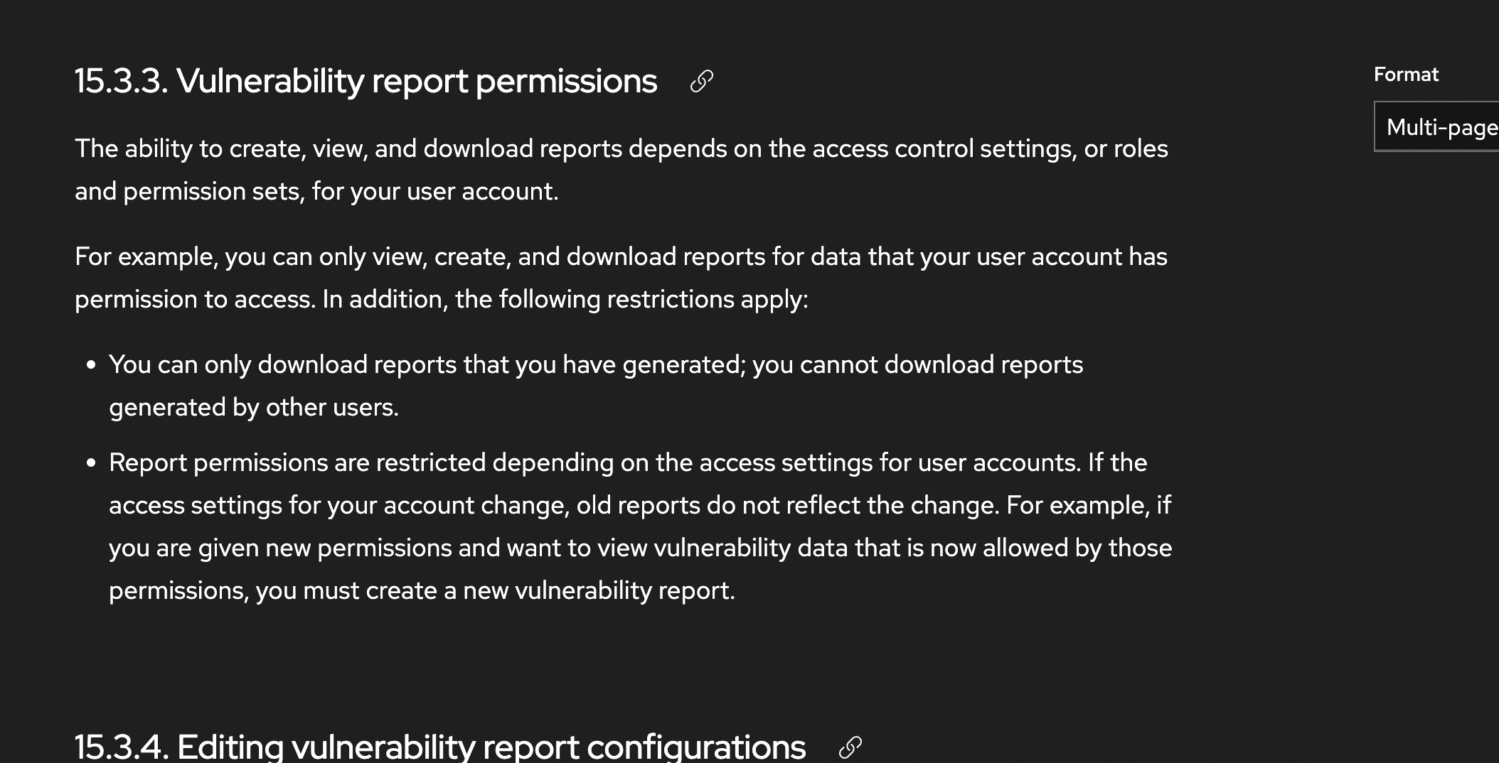 Please add this information about user permissions for vulnerability reporting in ACS's documentation. User needs following permissions for vulnerability reporting