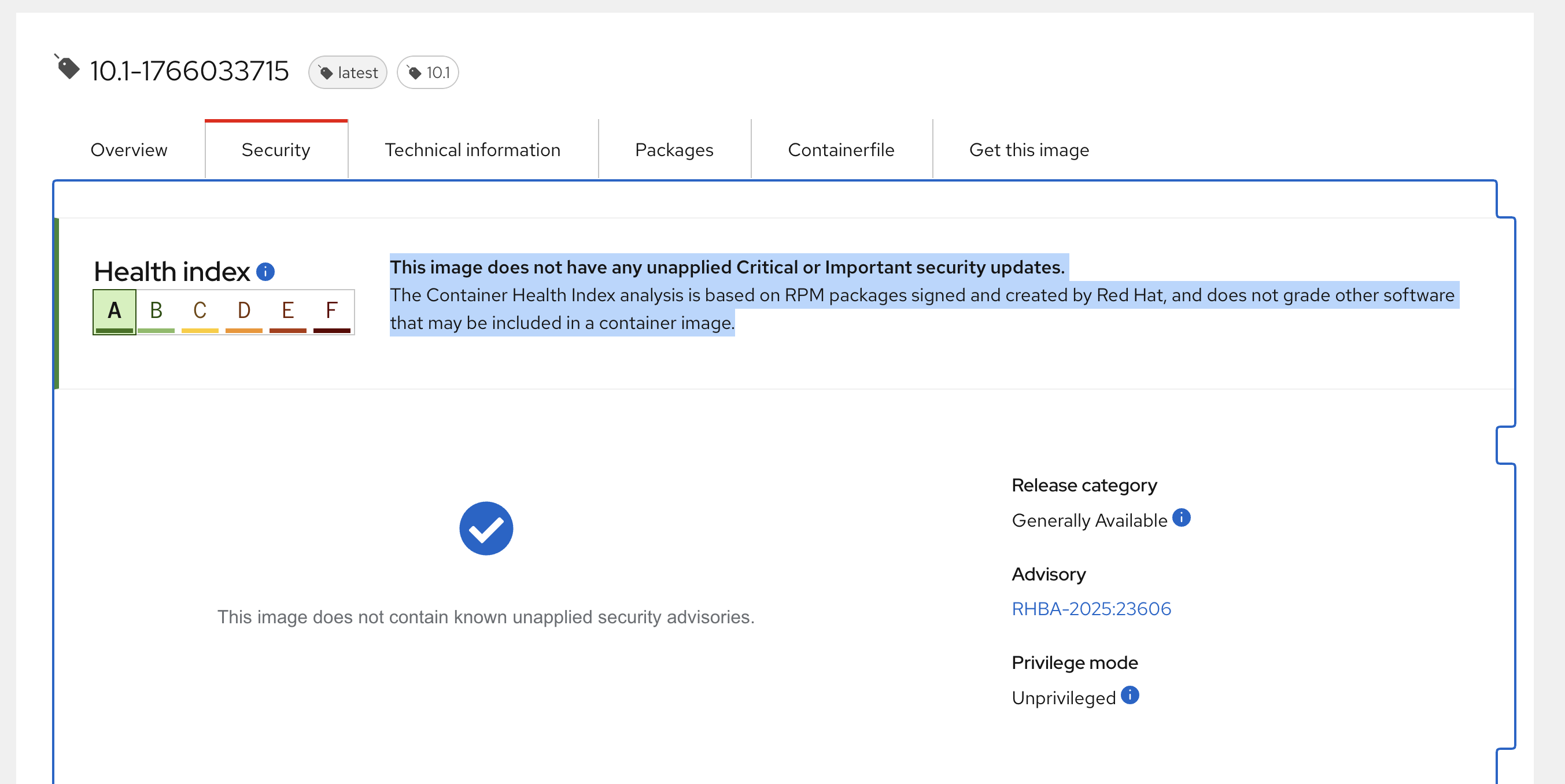 - But according to the Red Hat Container Catalog https://catalog.redhat.com/en/software/containers/ubi10/ubi-minimal/66f1504a379b9c2cf23e145c#security, this image does not have any unfixed vulnerability.