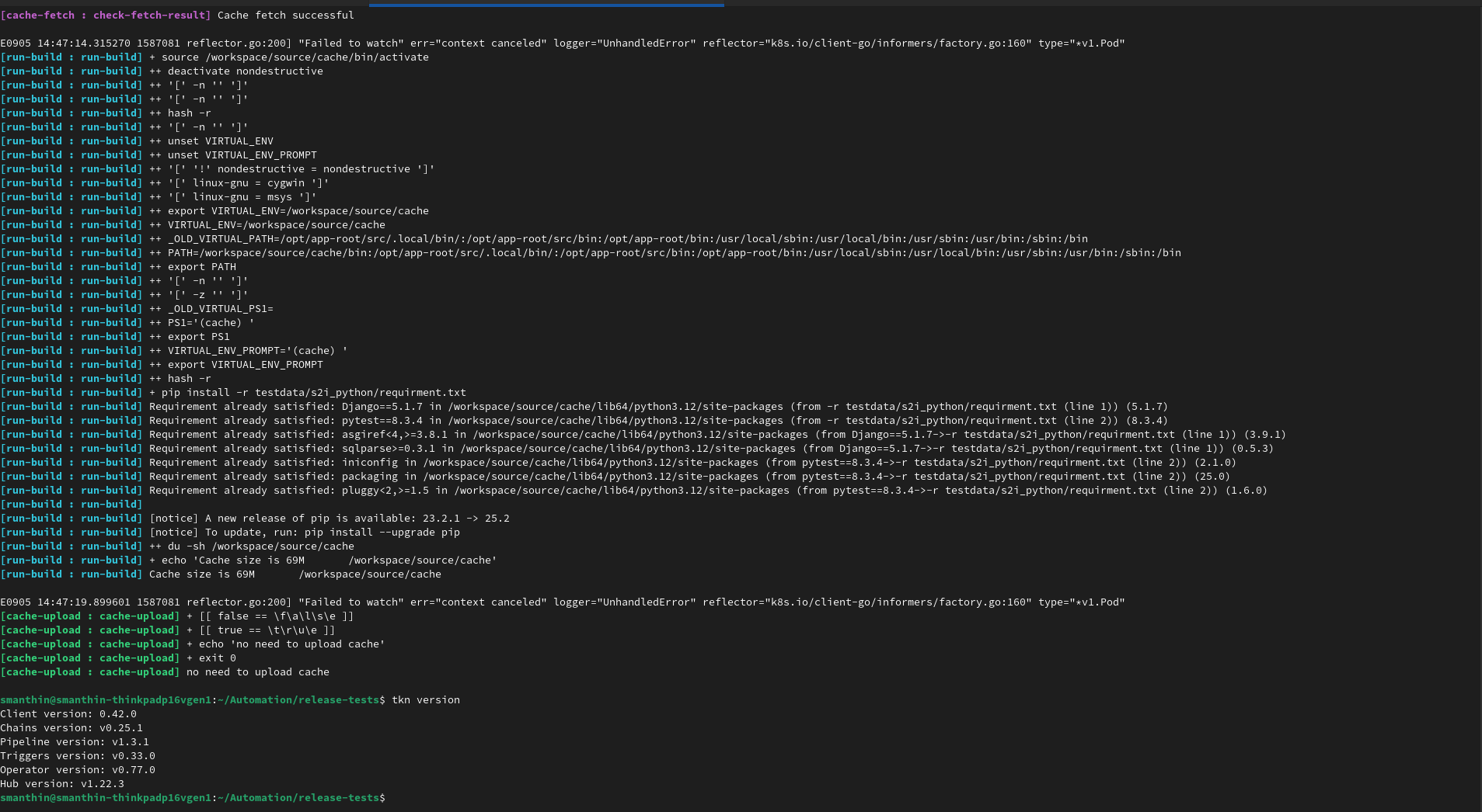 $ tkn version Client version: 0.42.0 Chains version: v0.25.1 Pipeline version: v1.3.1 Triggers version: v0.33.0 Operator version: v0.77.0 Hub version: v1.22.3