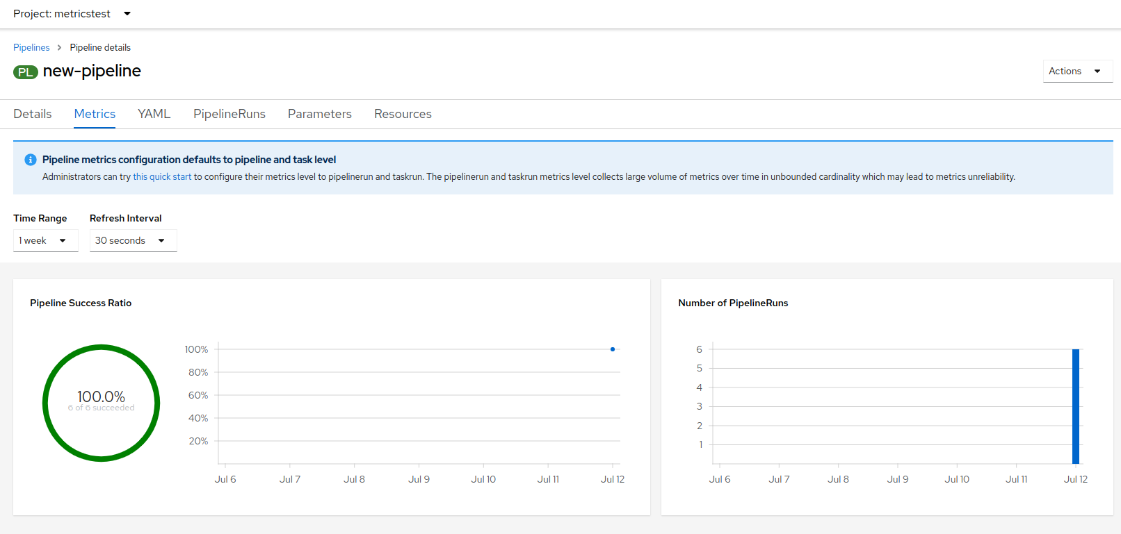 UI shows also data from previous installations of operator. Notice that the chart "Pipeline Success Ratio" shows different number of pipeline runs than other three charts.