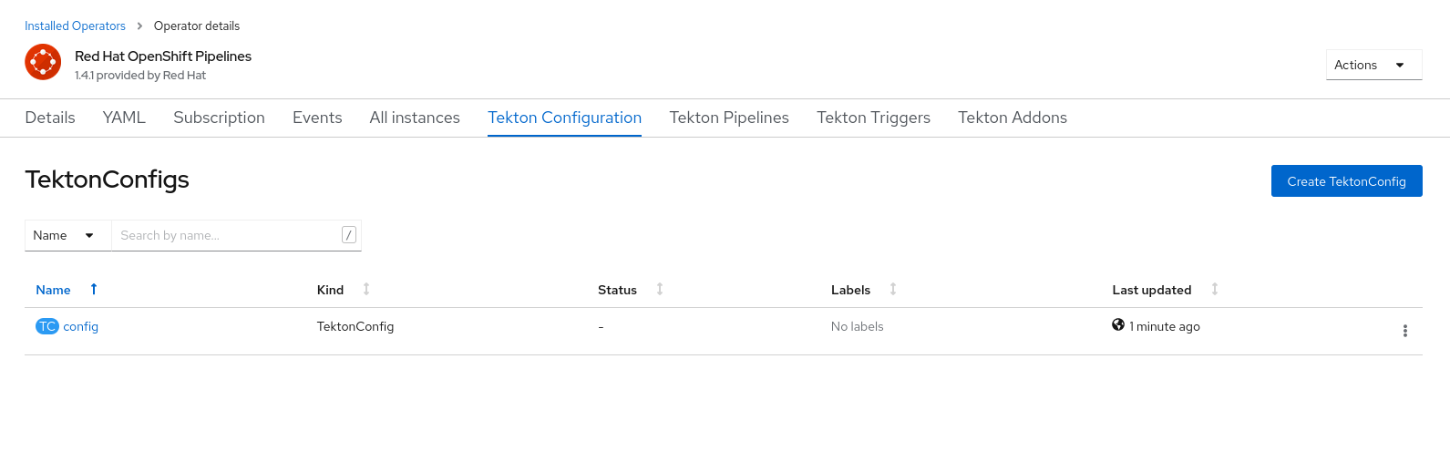 spec: apiservicedefinitions: {} customresourcedefinitions: owned: - description: Represents an installation of latest version of Tekton components, TektonPipeline, TektonTrigger and TektonAddon displayName: Tekton Configuration kind: TektonConfig name: tektonconfigs.operator.tekton.dev