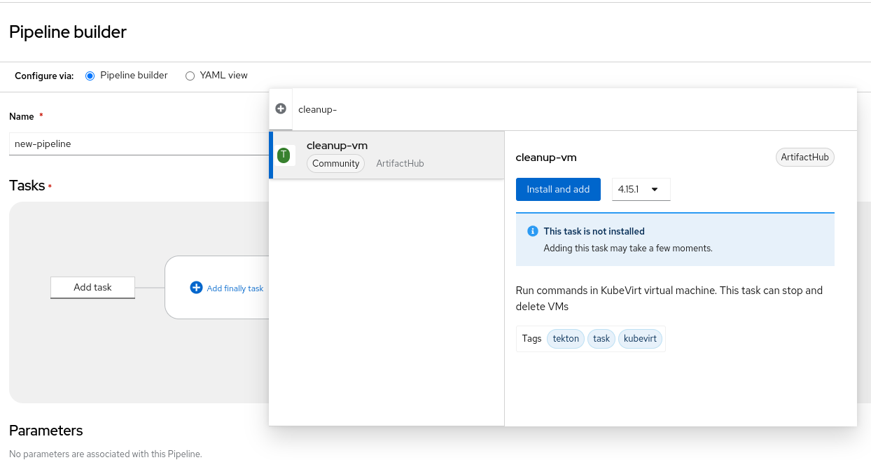 However the https://github.com/openshift-pipelines/tektoncd-catalog/tree/p/tasks/cleanup-vm is available to add via UI - see picture