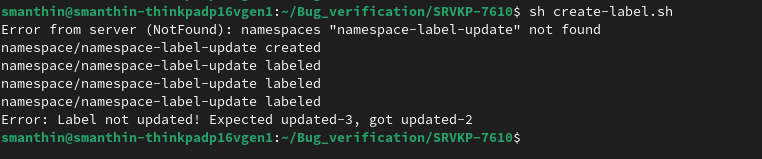oc delete namespace namespace-label-update; oc create namespace namespace-label-update; for i in {1..50}; do new_value="updated-$i"; oc label namespace namespace-label-update example/service="${new_value}" --overwrite; sleep 1; current_value=$(oc get namespace namespace-label-update -o jsonpath='{.metadata.labels.example/service}'); if [ "${current_value}" != "${new_value}" ]; then echo "Error: Label not updated! Expected ${new_value}, got ${current_value}"; break; fi; done