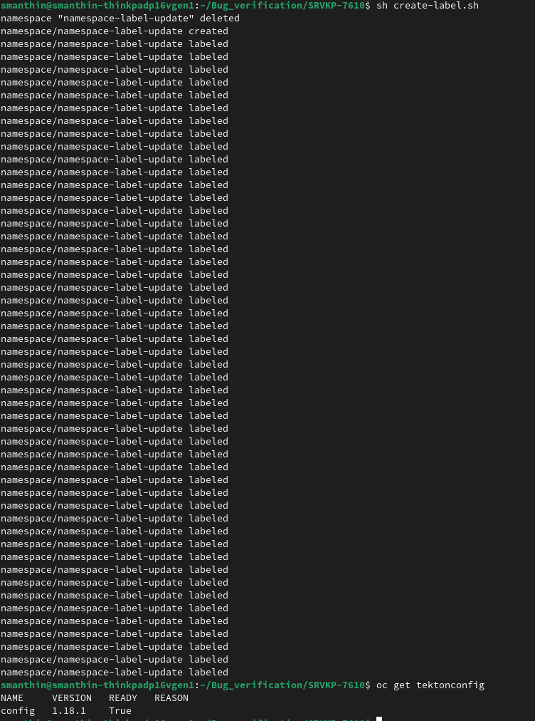 namespace "namespace-label-update" deleted namespace/namespace-label-update created namespace/namespace-label-update labeled namespace/namespace-label-update labeled namespace/namespace-label-update labeled namespace/namespace-label-update labeled namespace/namespace-label-update labeled namespace/namespace-label-update labeled Error: Label not updated! Expected updated-6, got updated-4 $ oc get namespace namespace-label-update -o yaml --show-managed-fields ... - apiVersion: v1 fieldsType: FieldsV1 fieldsV1: f:metadata: f:labels: f:example/service: {} f:openshift-pipelines.tekton.dev/namespace-reconcile-version: {} f:pod-security.kubernetes.io/audit: {} f:pod-security.kubernetes.io/warn: {} manager: openshift-pipelines-operator operation: Update time: "2025-05-09T14:57:16Z"