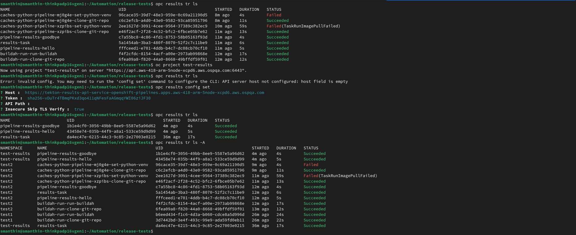 Successfully run a results command (e.g., opc results pipelineruns list) in Namespace A