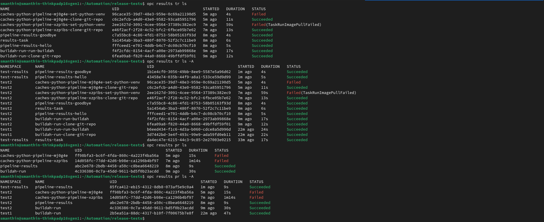 Using opc results list commands like taskrun list or pipelineruns list -A results in cryptic or non-informative error messages: