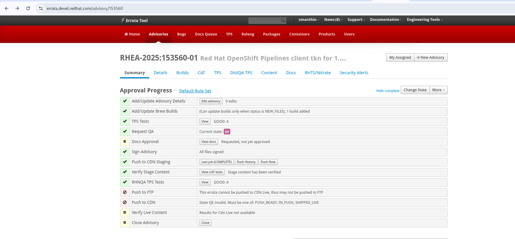 - If the CLI advisory cannot be transitioned to QE state and you see a message similar to "Missing 1 product listing, The brew files are incomplete for the following build and need to be reloaded: openshift-pipelines-client-1.17.0-11683.el8", somebody needs to create a ticket like https://issues.redhat.com/browse/CWFCONF-11052