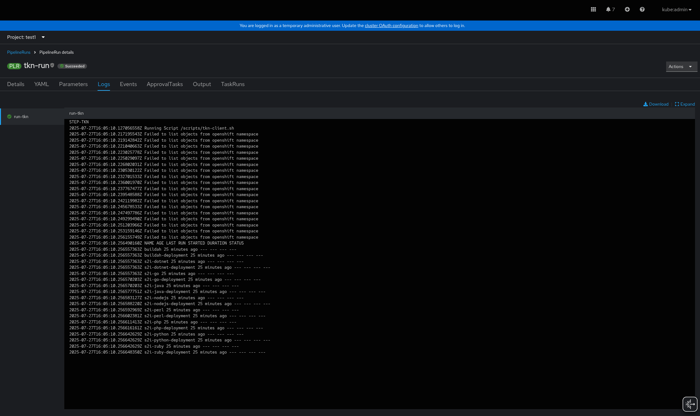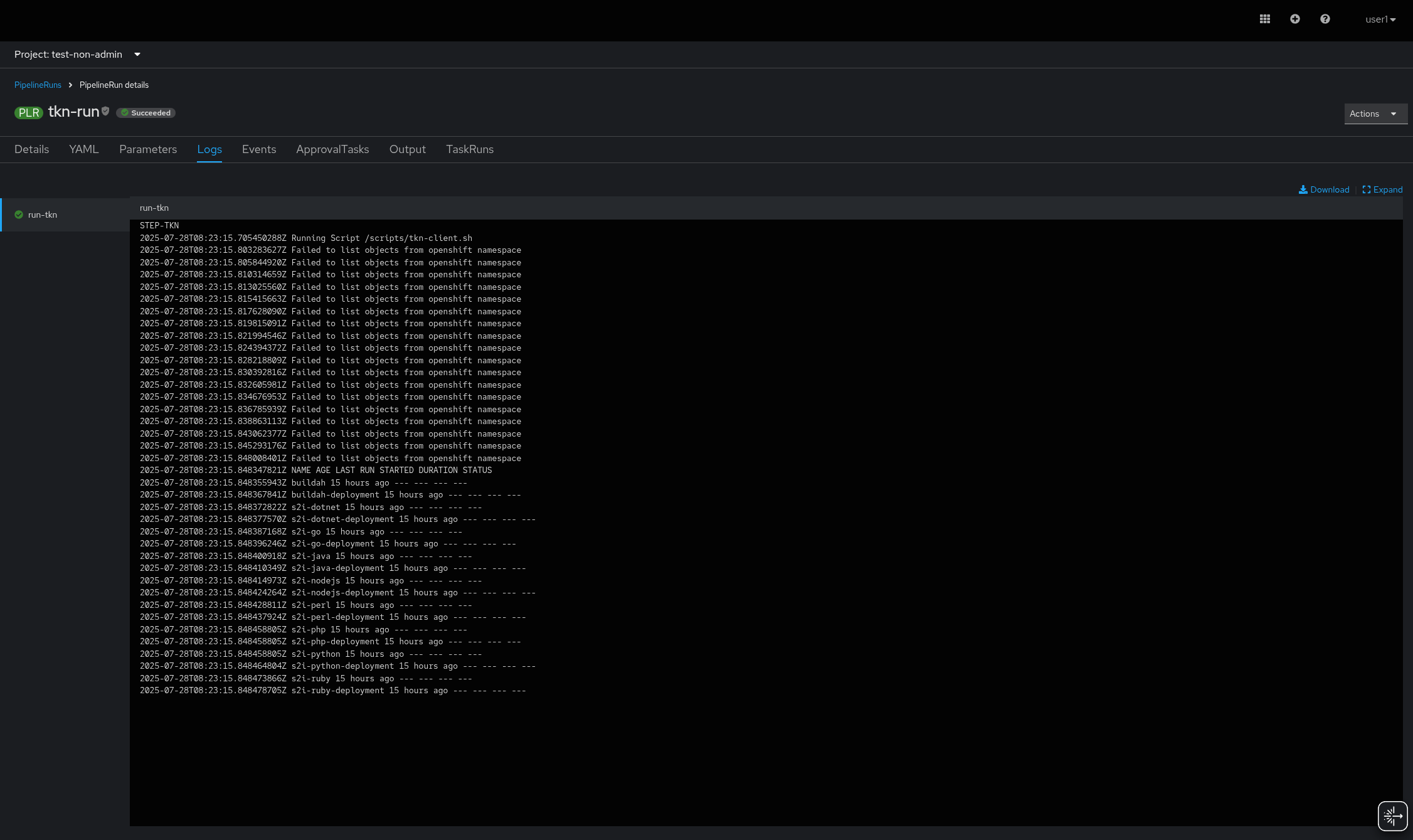 $ tkn pr ls NAME STARTED DURATION STATUS tkn-run 1 minute ago 7s Succeeded $ tkn pr logs -f tkn-run [run-tkn : tkn] Running Script /scripts/tkn-client.sh [run-tkn : tkn] Failed to list objects from openshift namespace [run-tkn : tkn] Failed to list objects from openshift namespace [run-tkn : tkn] Failed to list objects from openshift namespace [run-tkn : tkn] Failed to list objects from openshift namespace [run-tkn : tkn] Failed to list objects from openshift namespace [run-tkn : tkn] Failed to list objects from openshift namespace [run-tkn : tkn] Failed to list objects from openshift namespace [run-tkn : tkn] Failed to list objects from openshift namespace [run-tkn : tkn] Failed to list objects from openshift namespace [run-tkn : tkn] Failed to list objects from openshift namespace [run-tkn : tkn] Failed to list objects from openshift namespace [run-tkn : tkn] Failed to list objects from openshift namespace [run-tkn : tkn] Failed to list objects from openshift namespace [run-tkn : tkn] Failed to list objects from openshift namespace [run-tkn : tkn] Failed to list objects from openshift namespace [run-tkn : tkn] Failed to list objects from openshift namespace [run-tkn : tkn] Failed to list objects from openshift namespace [run-tkn : tkn] Failed to list objects from openshift namespace [run-tkn : tkn] NAME AGE LAST RUN STARTED DURATION STATUS [run-tkn : tkn] buildah 15 hours ago --- --- --- --- [run-tkn : tkn] buildah-deployment 15 hours ago --- --- --- --- [run-tkn : tkn] s2i-dotnet 15 hours ago --- --- --- --- [run-tkn : tkn] s2i-dotnet-deployment 15 hours ago --- --- --- --- [run-tkn : tkn] s2i-go 15 hours ago --- --- --- --- [run-tkn : tkn] s2i-go-deployment 15 hours ago --- --- --- --- [run-tkn : tkn] s2i-java 15 hours ago --- --- --- --- [run-tkn : tkn] s2i-java-deployment 15 hours ago --- --- --- --- [run-tkn : tkn] s2i-nodejs 15 hours ago --- --- --- --- [run-tkn : tkn] s2i-nodejs-deployment 15 hours ago --- --- --- --- [run-tkn : tkn] s2i-perl 15 hours ago --- --- --- --- [run-tkn : tkn] s2i-perl-deployment 15 hours ago --- --- --- --- [run-tkn : tkn] s2i-php 15 hours ago --- --- --- --- [run-tkn : tkn] s2i-php-deployment 15 hours ago --- --- --- --- [run-tkn : tkn] s2i-python 15 hours ago --- --- --- --- [run-tkn : tkn] s2i-python-deployment 15 hours ago --- --- --- --- [run-tkn : tkn] s2i-ruby 15 hours ago --- --- --- --- [run-tkn : tkn] s2i-ruby-deployment 15 hours ago --- --- --- ---