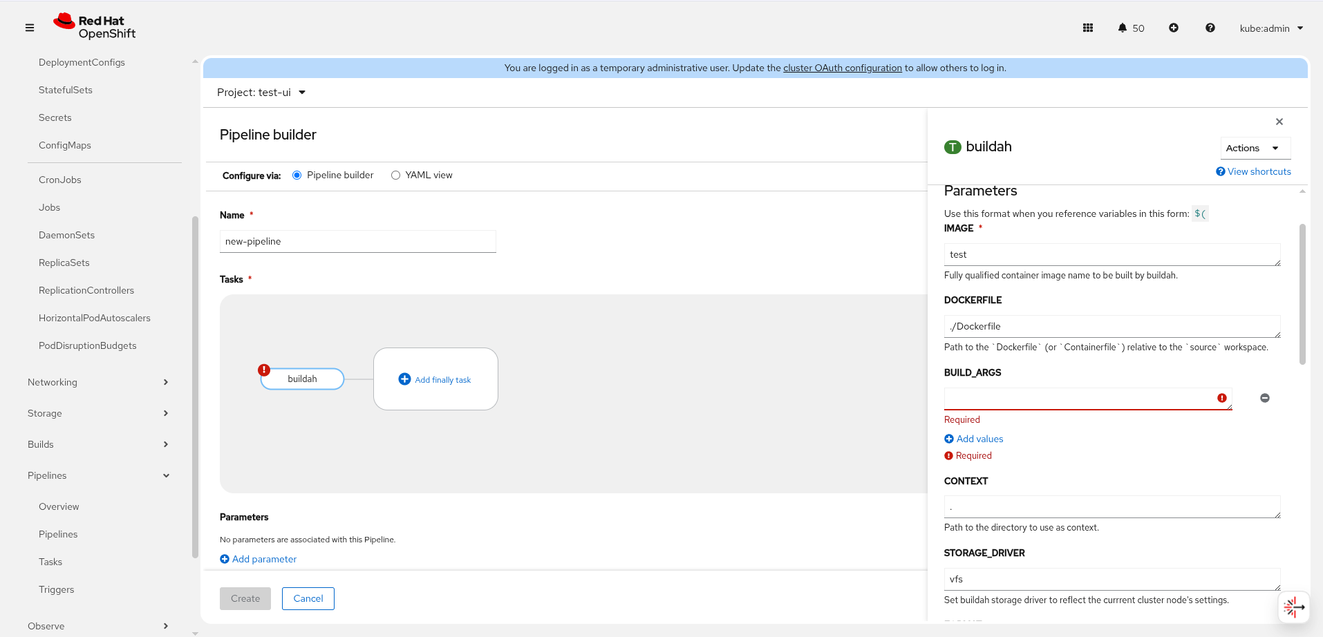 QE - [1.19.x] Pipeline builder UI fails to save buildah task with default BUILD_ARGS parameter