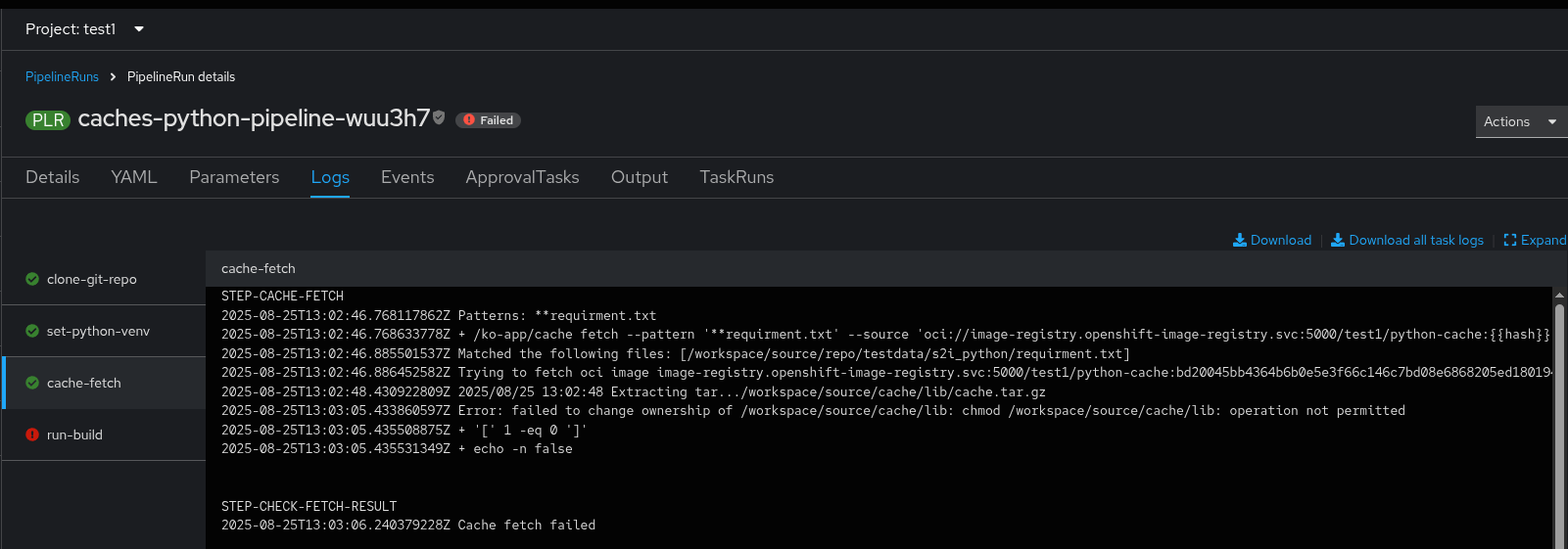 STEP-CACHE-FETCH2025-08-25T13:02:46.768117862Z Patterns: **requirment.txt2025-08-25T13:02:46.768633778Z + /ko-app/cache fetch --pattern '**requirment.txt' --source 'oci://image-registry.openshift-image-registry.svc:5000/test1/python-cache:{{hash}}' --folder /workspace/source/cache/lib --insecure false --workingdir /workspace/source/repo2025-08-25T13:02:46.885501537Z Matched the following files: [/workspace/source/repo/testdata/s2i_python/requirment.txt]2025-08-25T13:02:46.886452582Z Trying to fetch oci image image-registry.openshift-image-registry.svc:5000/test1/python-cache:bd20045bb4364b6b0e5e3f66c146c7bd08e6868205ed180194346571cbcb91b3 in /workspace/source/cache/lib2025-08-25T13:02:48.430922809Z 2025/08/25 13:02:48 Extracting tar.../workspace/source/cache/lib/cache.tar.gz2025-08-25T13:03:05.433860597Z Error: failed to change ownership of /workspace/source/cache/lib: chmod /workspace/source/cache/lib: operation not permitted2025-08-25T13:03:05.435508875Z + '[' 1 -eq 0 ']'2025-08-25T13:03:05.435531349Z + echo -n falseSTEP-CHECK-FETCH-RESULT2025-08-25T13:03:06.240379228Z Cache fetch failed
