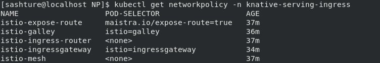 oc create -f - <<EOF apiVersion: extensions/v1beta1 kind: NetworkPolicy metadata: name: cluster-local-gateway namespace: knative-serving-ingress spec: ingress: - from: - namespaceSelector: {} podSelector: matchLabels: istio: cluster-local-gateway policyTypes: - Ingress EOF