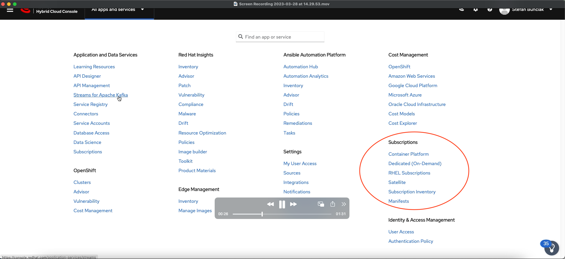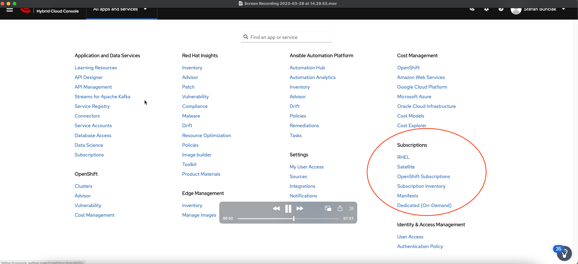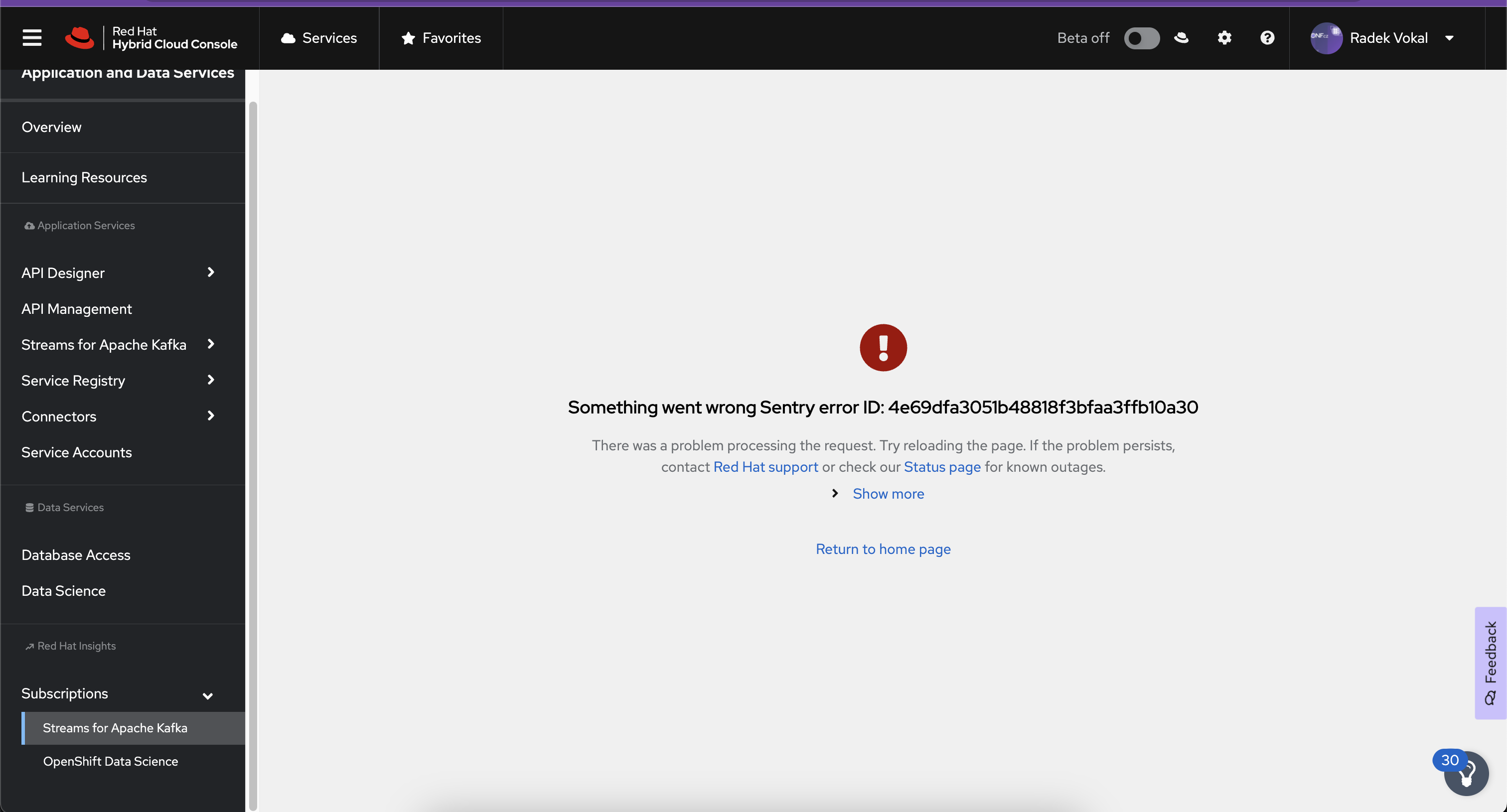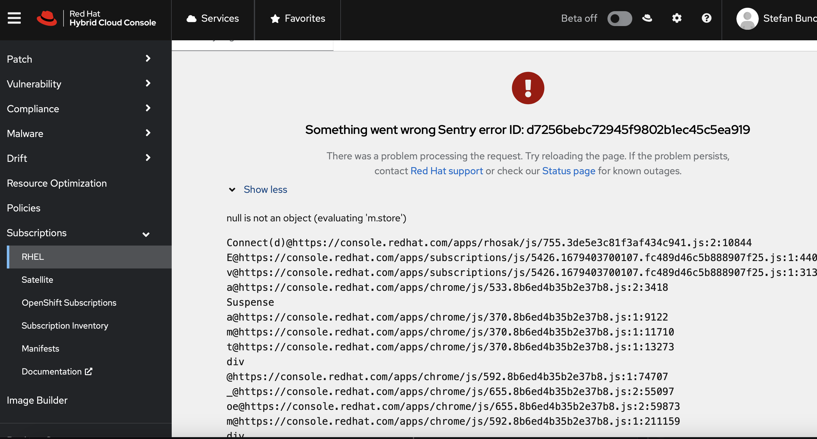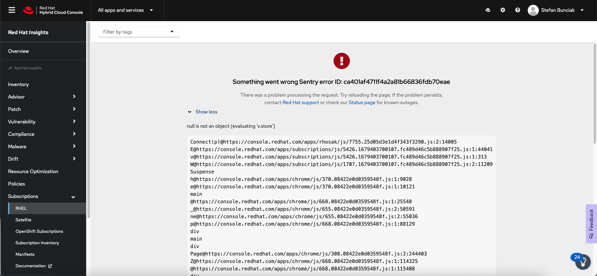 Navigating to Subscriptions - RHEL caused a Something went wrong error. See the screenshot and attached console log. Refreshing the page fixed it.