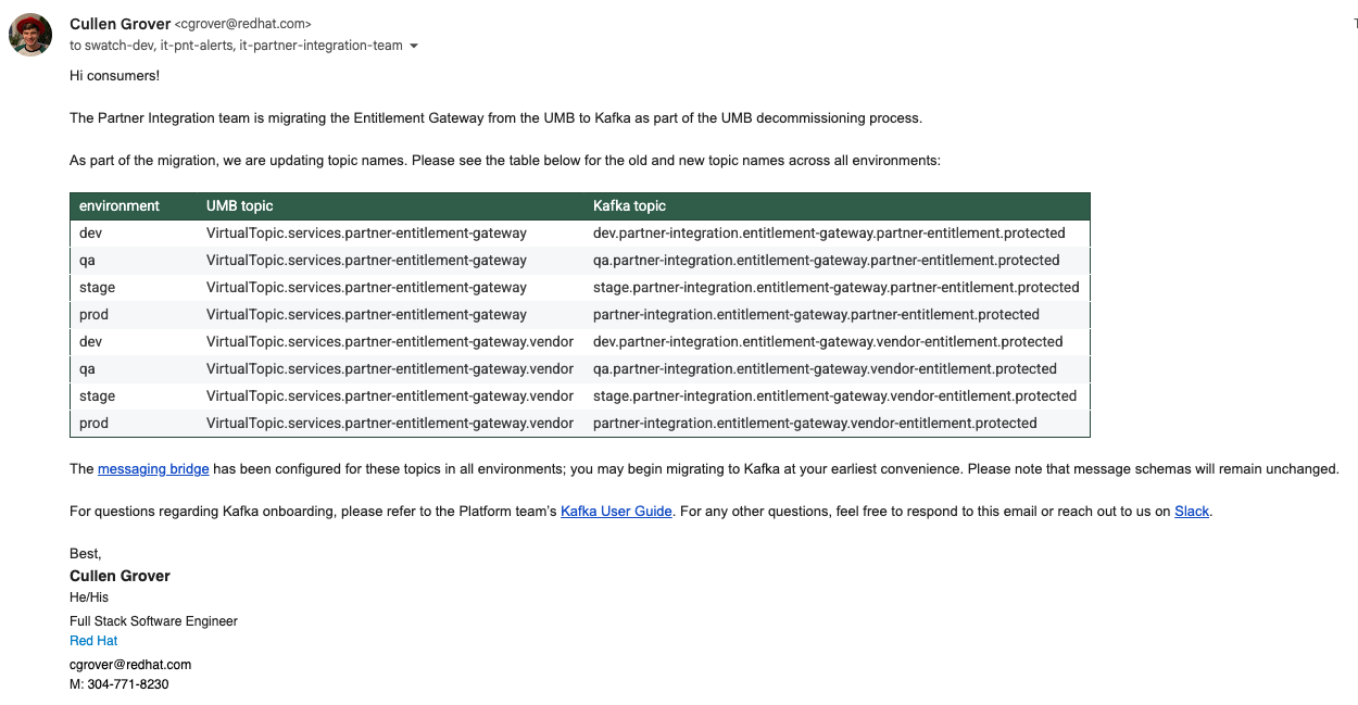 • Migrate from existing UMB topics to Kafka topics for IT Partner Gateway Service communication