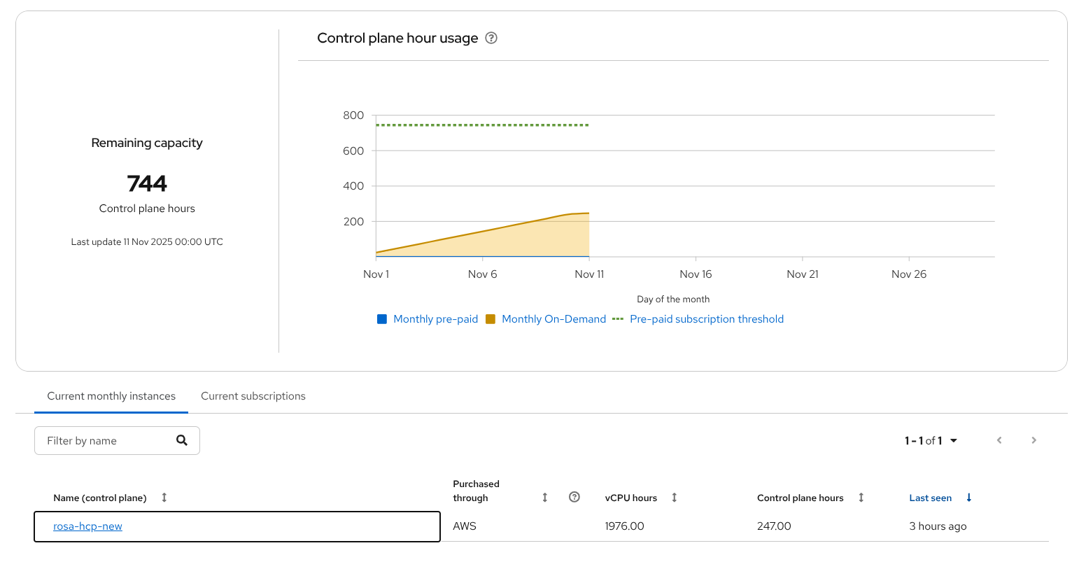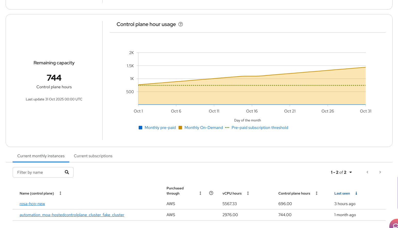 From Subscription Usage of the Long Run Tester account we can see that there is no usage for the fake cluster