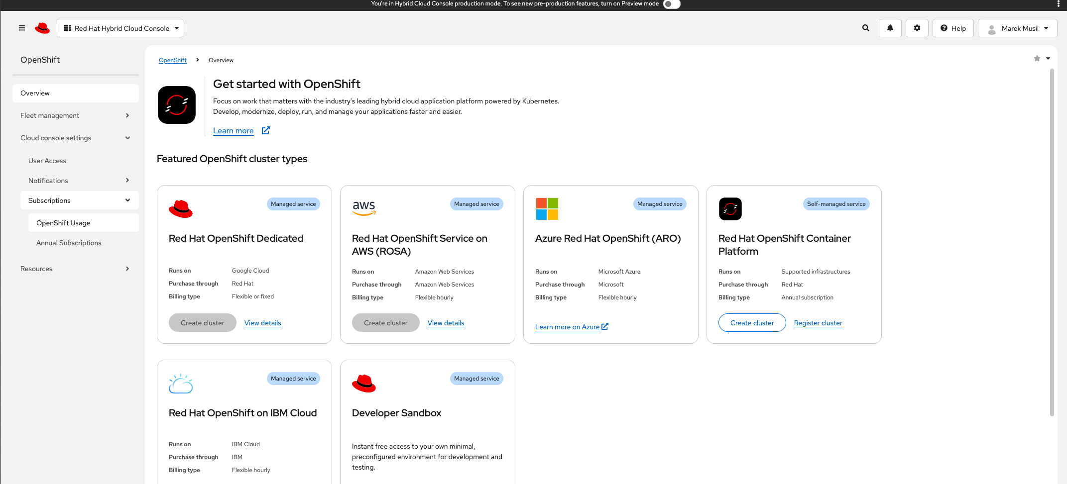 view = navigate_to(curiosity_user_app.platform_ui, "OpenShiftOverview") assert view.is_displayed nav_tree = view.navigation.nav_item_tree() view.navigation.select("Subscriptions") > assert "Subscriptions" in nav_tree E AssertionError: assert 'Subscriptions' in OrderedDict({'Overview': None, 'Fleet management': OrderedDict({'Dashboard': None, 'Clusters': None, 'Advisor': ['Recommendations', 'Clusters', 'Workloads'], 'Vulnerability dashboard': ['CVEs', 'Clusters'], 'Cost Management': ['Overview', 'Optimizations', 'OpenShift', 'Amazon Web Services', 'Google Cloud', 'Microsoft Azure', 'Cost Explorer', 'Settings']}), 'Cloud console settings': OrderedDict({'User Access': None, 'Notifications': ['Configure Events', 'Notifications Preferences'], 'Subscriptions': ['OpenShift Usage', 'Annual Subscriptions']}), 'Resources': ['Learning Resources', 'Downloads', 'Releases', 'Assisted Installer']})iqe_curiosity/tests/ui/test_ui_navigation_menu.py:151: AssertionError