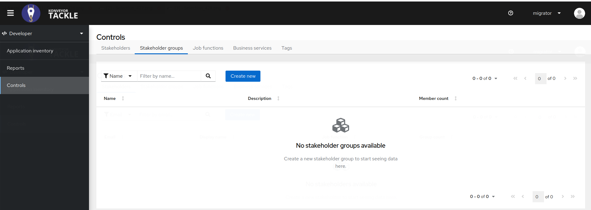 When logged into Tackle UI as the migrator user (has been set with the "tackle-migrator" role) - the UI displays menus and buttons that the migrator user should not have: