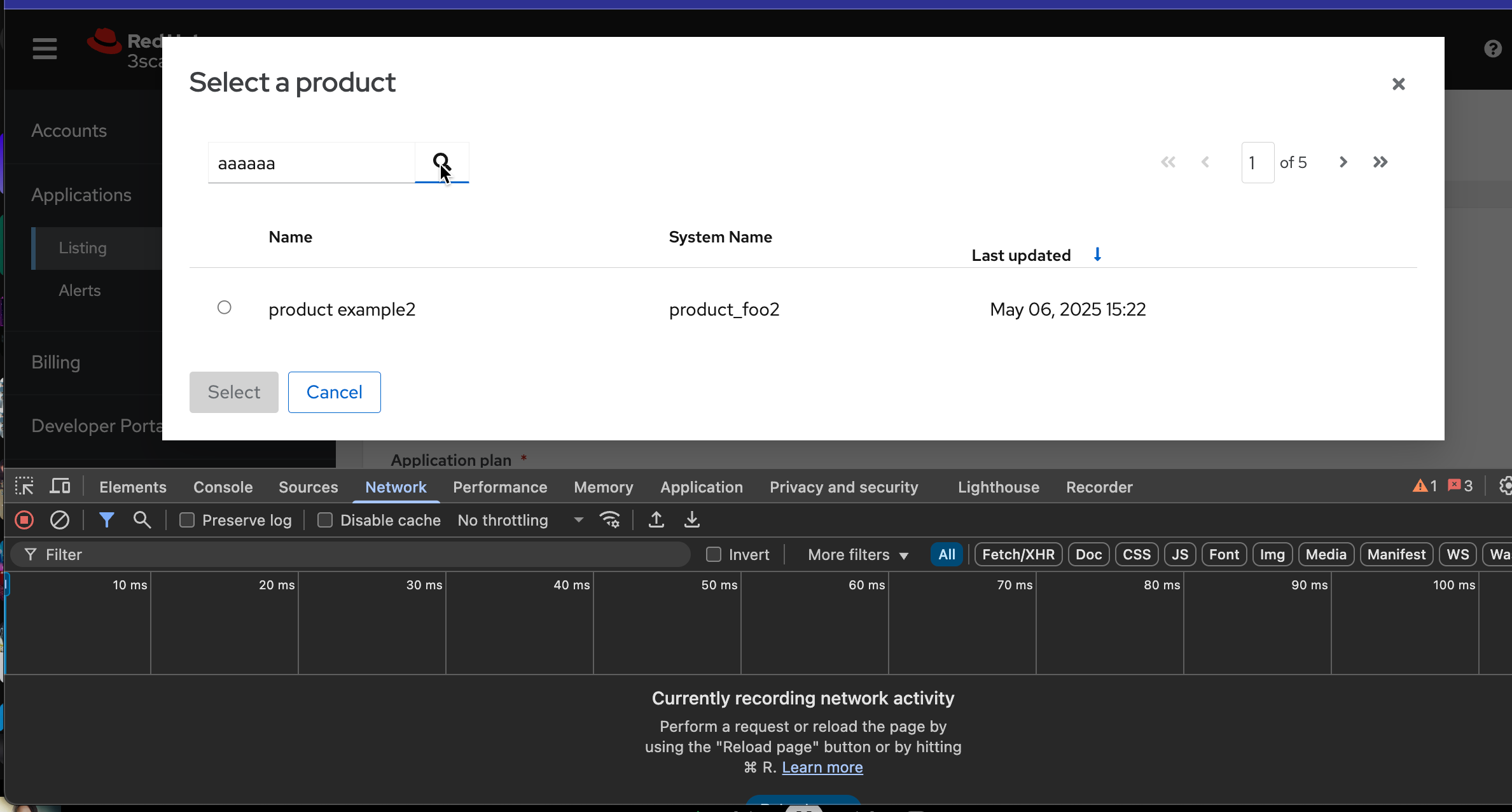 When creating an application, the search in the field Select a Product under Product doesn't work. Also when clicking View all products, the search box Find a product doesn't work either. The Product can be found in Products page. See screenshots.