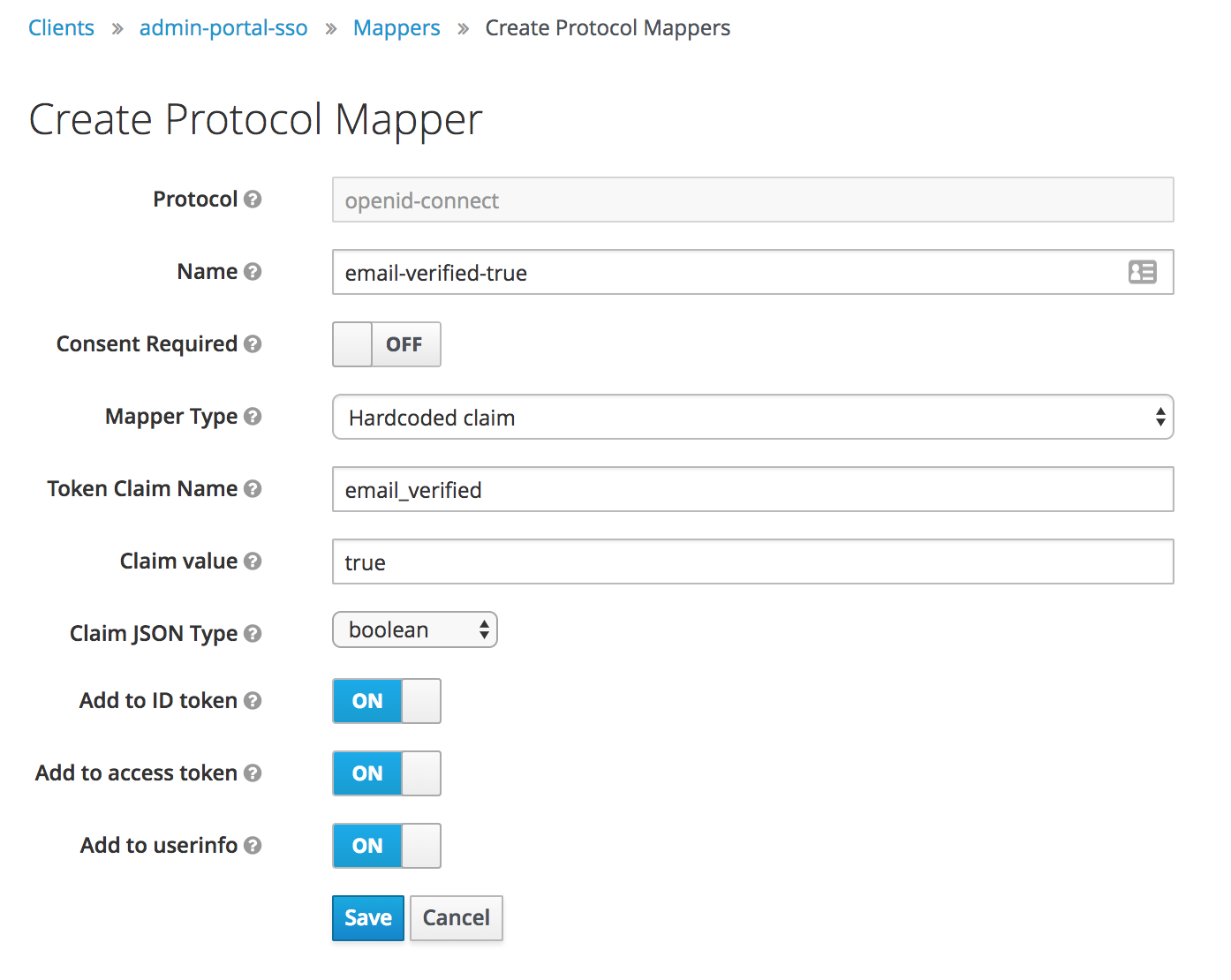 These instructions detail "Add Builtin" Mapper called "email verified". The problem is that this mapper will not work for User Federation, which is the approach most enterprises leverage. When User Federation is used, a hardcoded claim must be created with a token claim name "email_verified" and claim value set to "true".