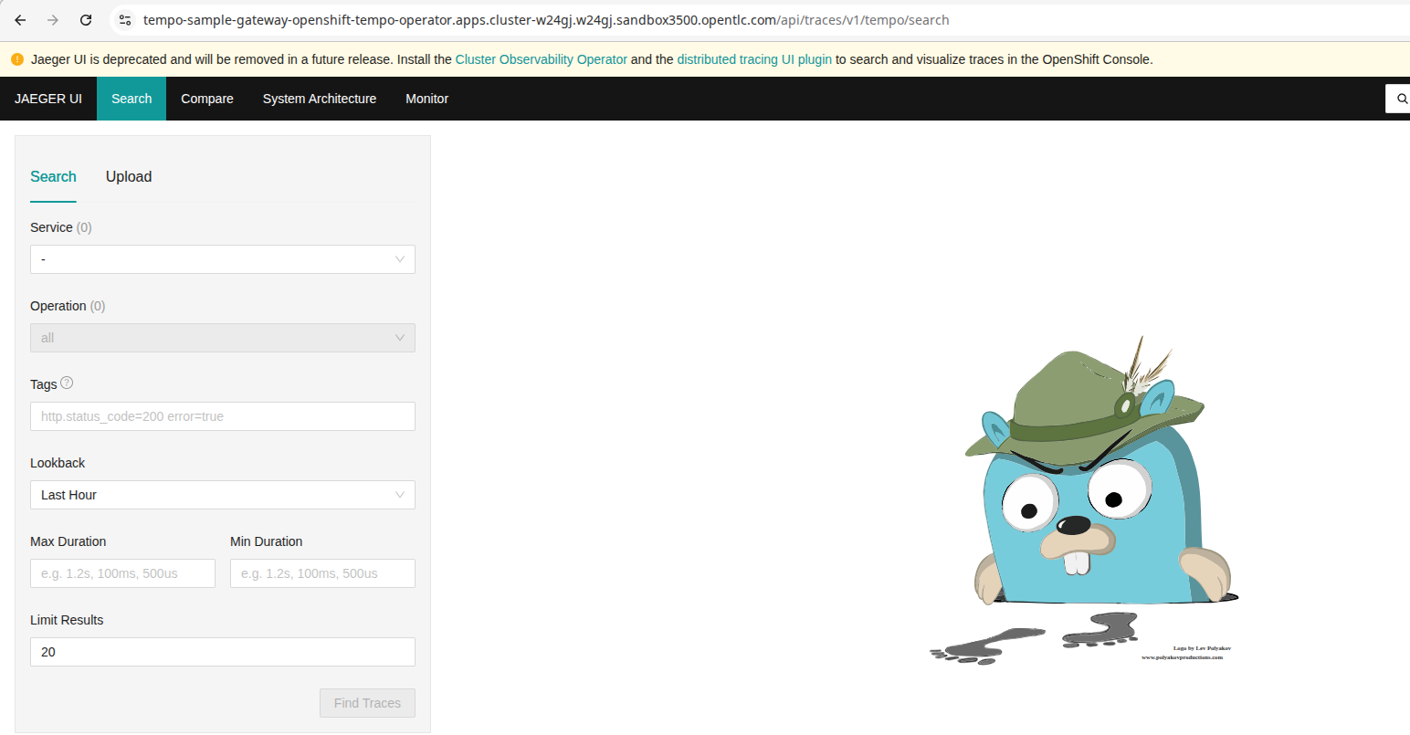 With this configuration in place, one can access https://tempo-foo-gateway-openshift-distributed-tracing.apps.foo.example.com/api/traces/v1/tempo/search and is ending up on the Jaeger UI as shown in the Screenshot.