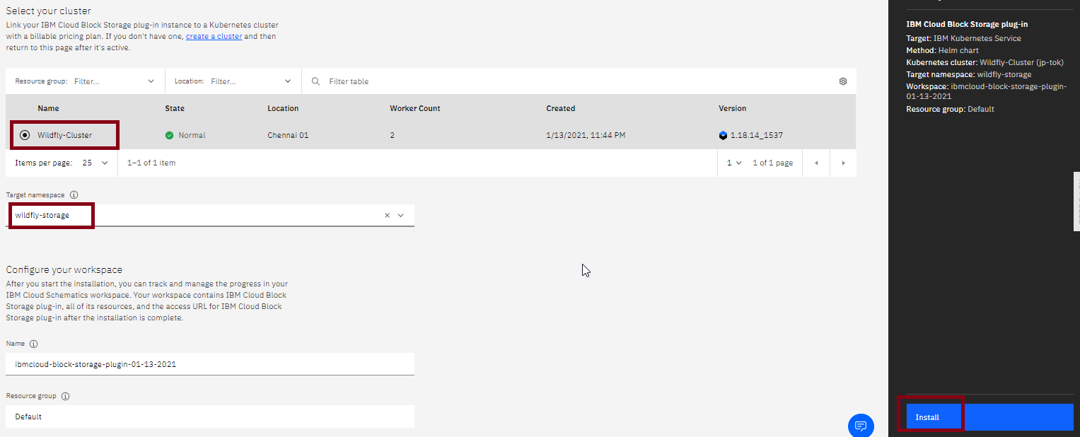 - Deploy the IBM Cloud Block-Storage Plugin to the created cluster, if you have already done this, skip to step 3.