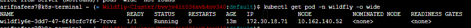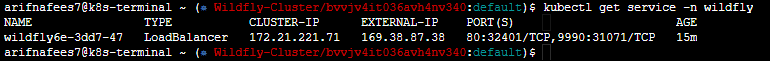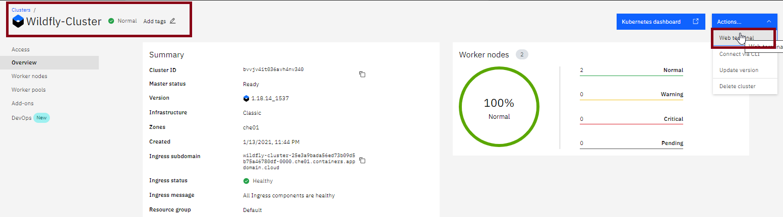 - When the terminal is installed, click on the action button again and click on web terminal and type the following command in below command window. It will show you the workspaces of your cluster, you can see Wildfly active.