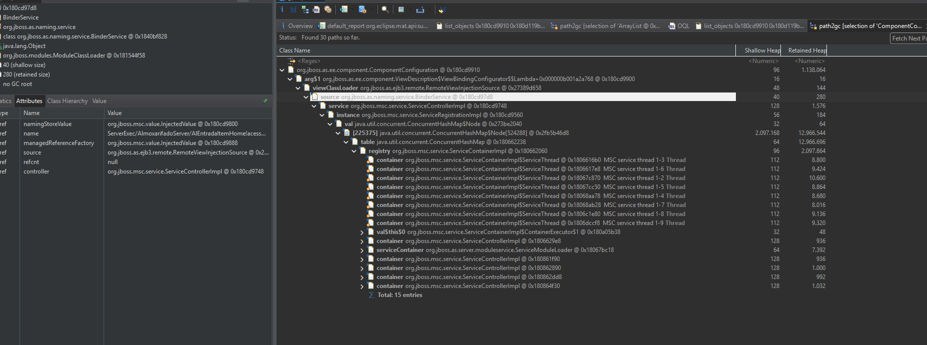 Analysis of the Heap Dump using MAT revealed that `org.jboss.as.ee.component.ComponentConfiguration` instances (which should be deployment-time only) are not being garbage collected.