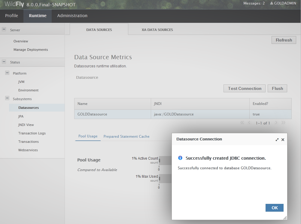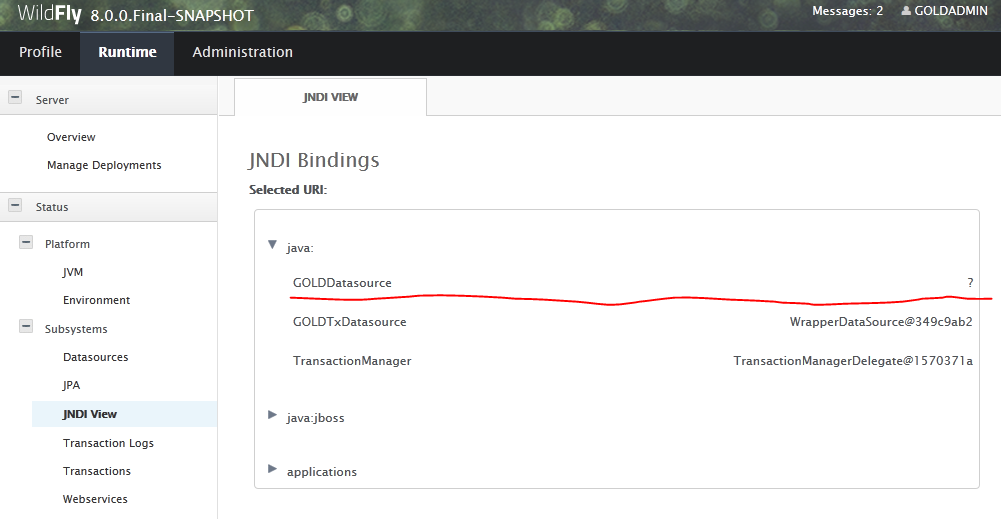 Also I can find and test connection of my “java:/MyDataSource” under the “Datasources” section of the WildFly Administration Console just fine(anoter word the datasource is there).